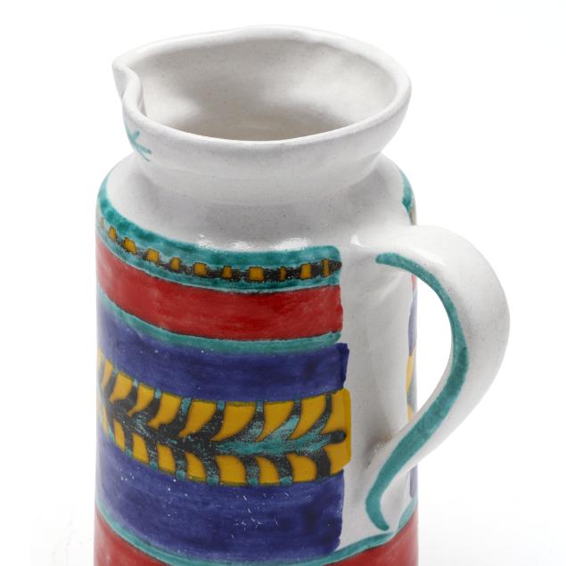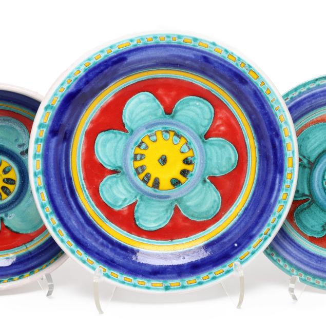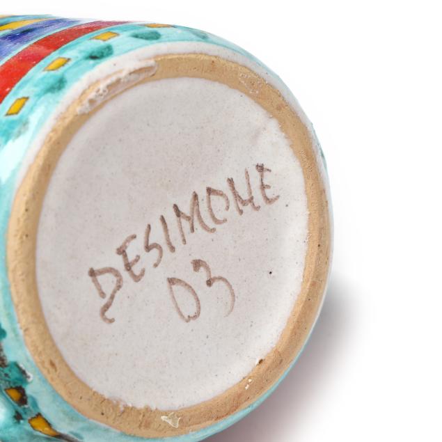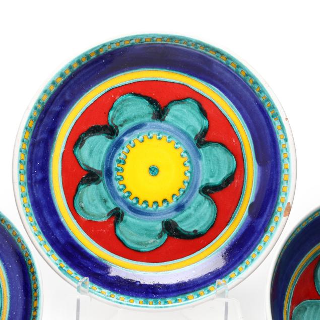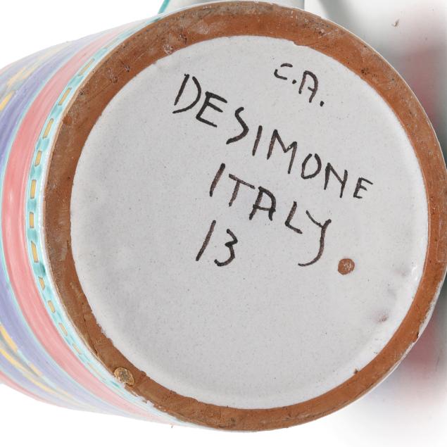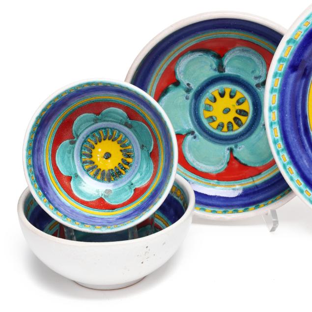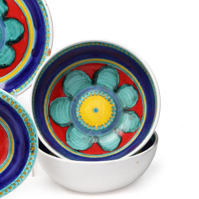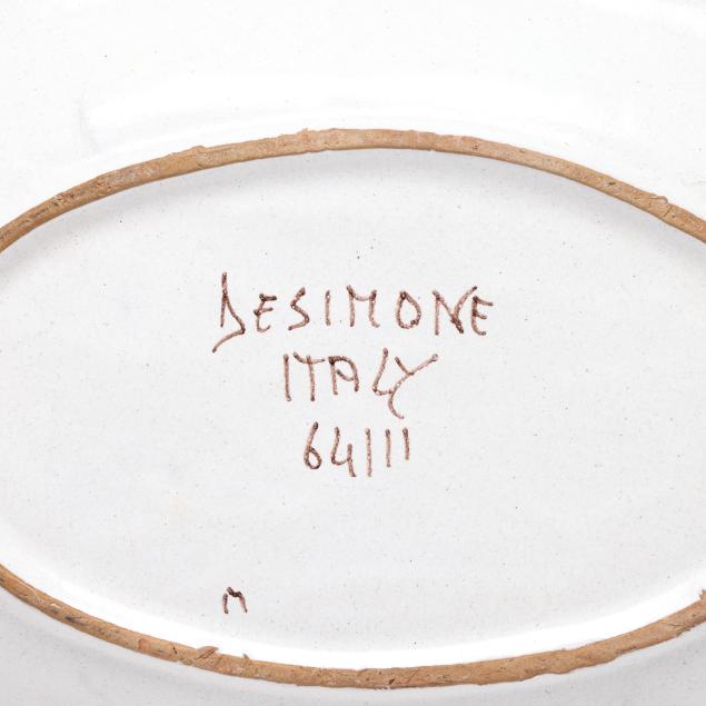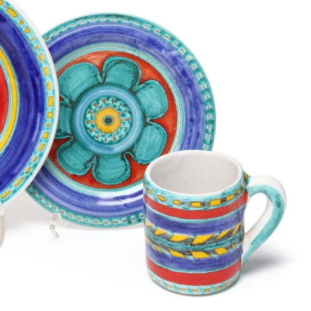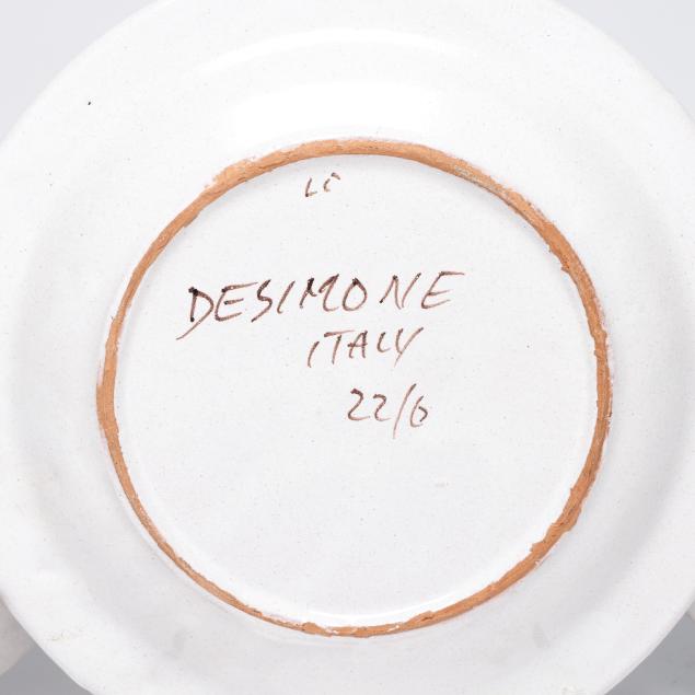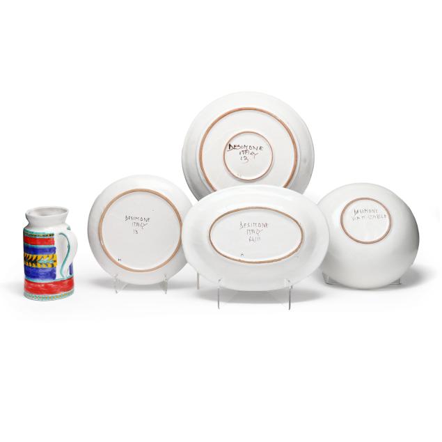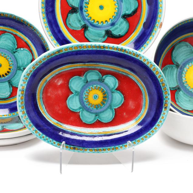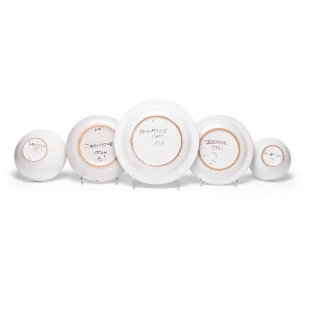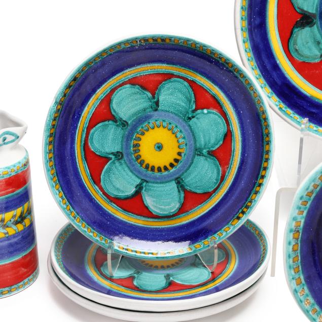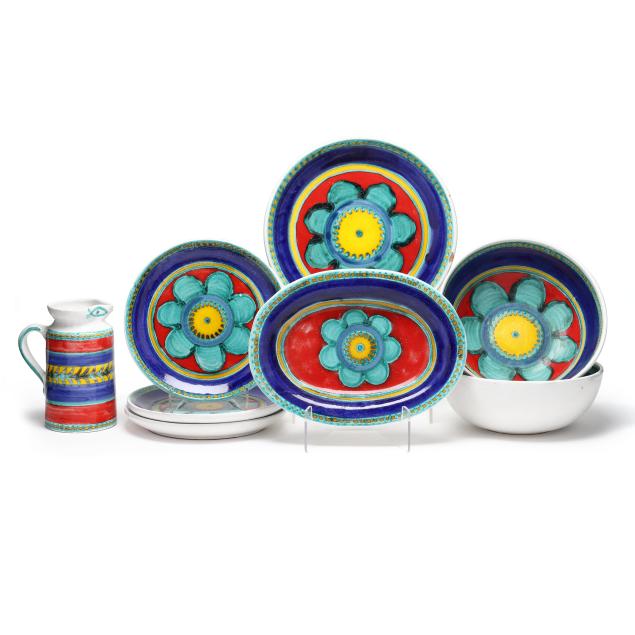 1960s, (85) hand-painted pieces with central turquoise flower motif and line patterning to rim to include (2) salad bowls (both approximately 12 in.); a circular platter (14 1/2 in.); an oval platter (15 in.); (3) chargers (11 5/8 in.); (35) dinner plates (all approximately 10 in.); (8) salad/dessert plates (all approximately 8 1/2 in.); (11) low bowls (all approximately 8 in.); (3) large footed bowls (7 3/8 in.); (3) medium footed bowls (6 3/8 in.); (12) small footed bowls (5 3/8 in.); (5) coffee mugs (all approximately 4 1/4 in.); and a pitcher (9 in.), almost all marked "DESIMONE/ITALY" and most with "13" pattern no. to underside, some marked with artist's signature.
