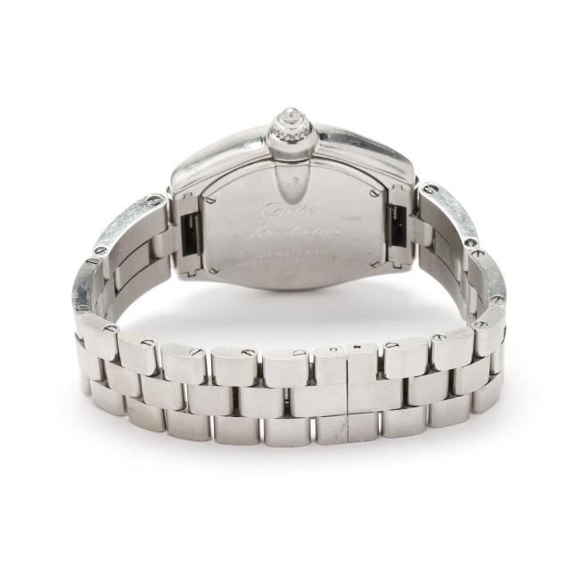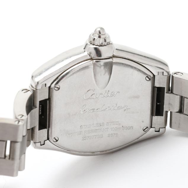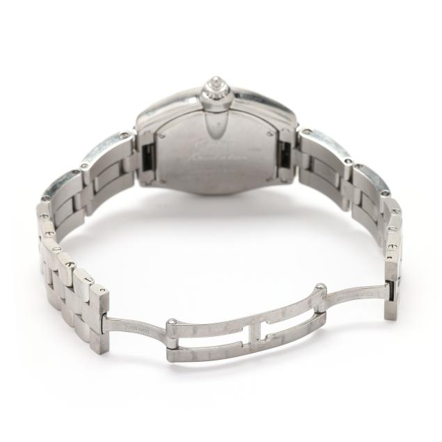 Quartz, Cartier 688, serial number 237577BB, reference number 2675, the barrel shaped stainless steel case with polished bezel, the signed pink dial with black Roman numeral hour markers, luminescent sword hands, and date window at 3:00 hour, the stainless steel 'H' link bracelet marked CCJJ, completed with signed butterfly deployant clasp, the caseback signed and numbered.