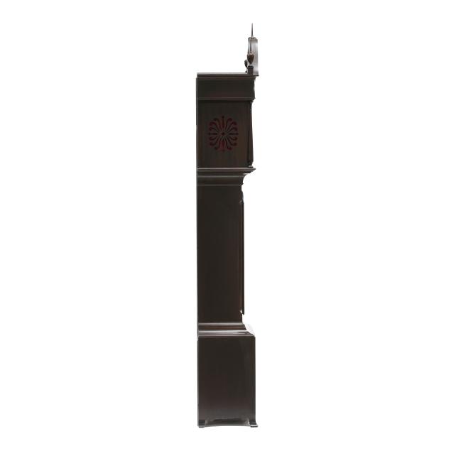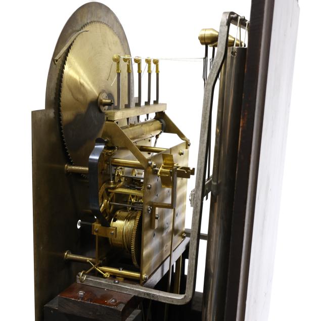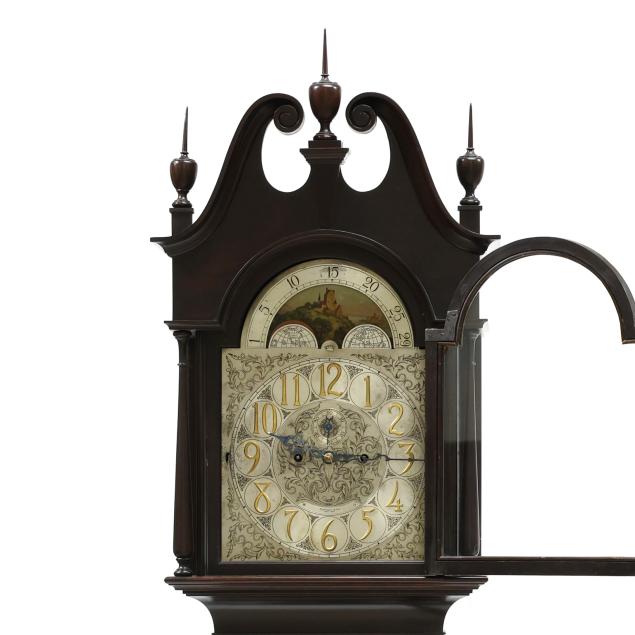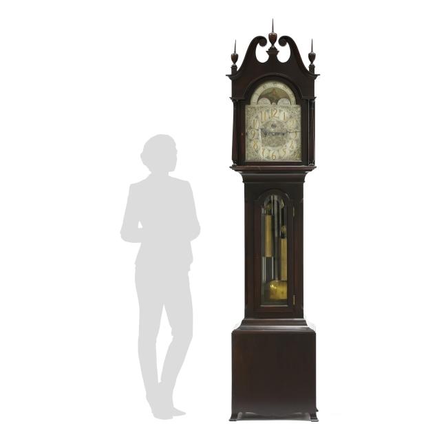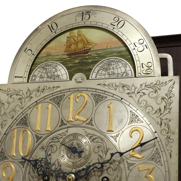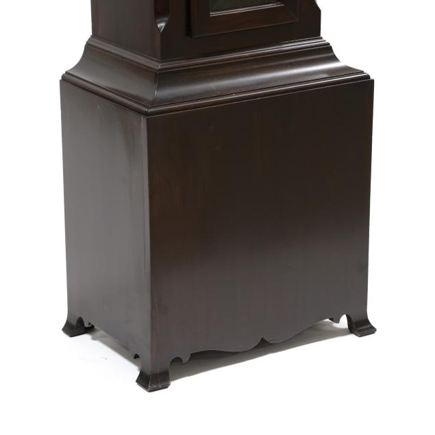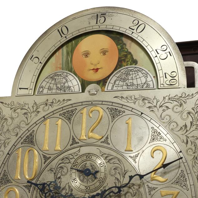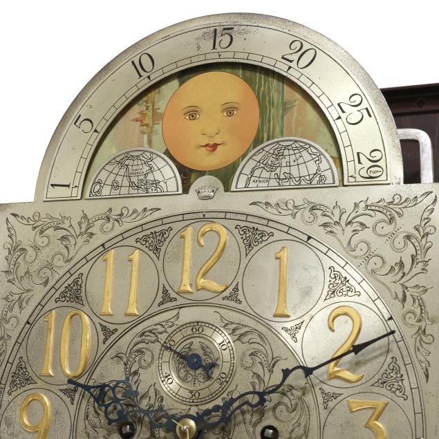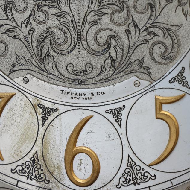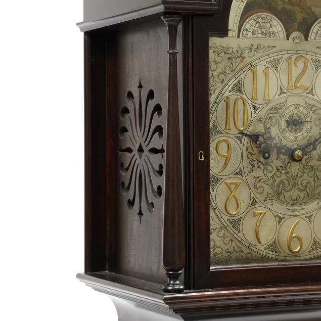 Made in Germany, early 20th century, in the Georgian taste, the ornate engraved silvered metal face with Herschede crown above a 12-1/4 in. round dial having Arabic chapters and subsidiary seconds dial, signed "TIFFANY & Co. / NEW YORK" with silent and chime option, upper lunette moon phase, dual weight driven eight day movement signed "HERSCHEDE" with crown and numbered "4063" and patent date "PAT'D JAN.12-09", within a Georgian style mahogany case, hood with broken arch pediment, three spire finials, and sides with round pierced scrollwork design, above a beveled glass case door flanked by chamfered corners, cove molded rectangular base with carved skirt and bracket feet, rear panel with numbered stamps. Includes pendulum, two weights, (5) tubular chimes, winding and case keys.