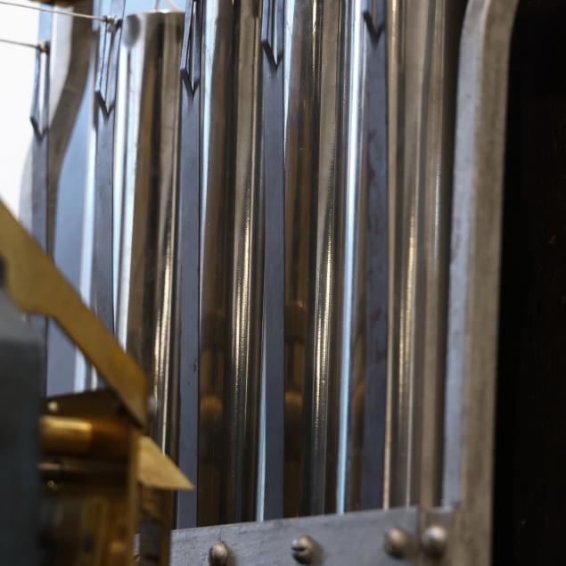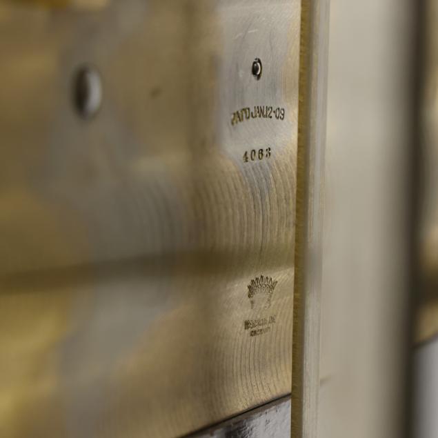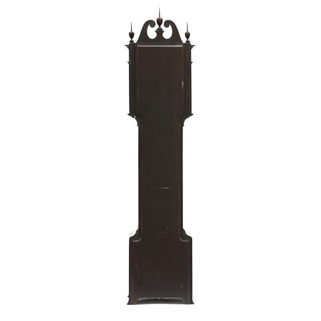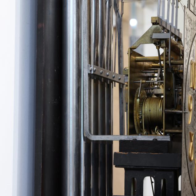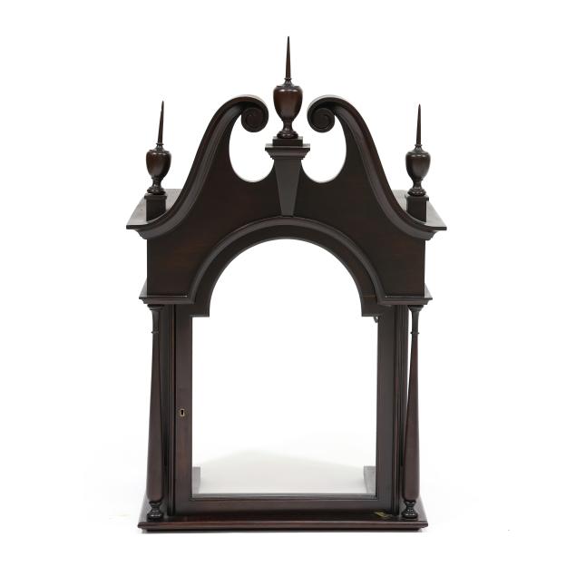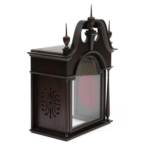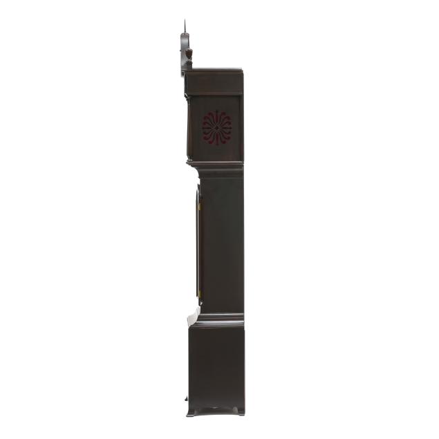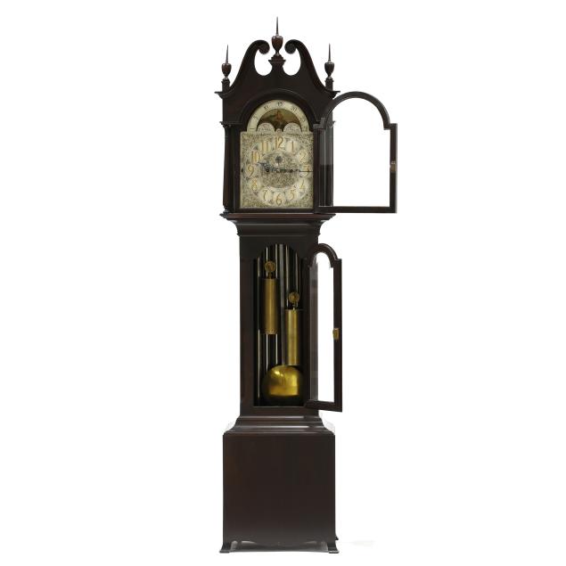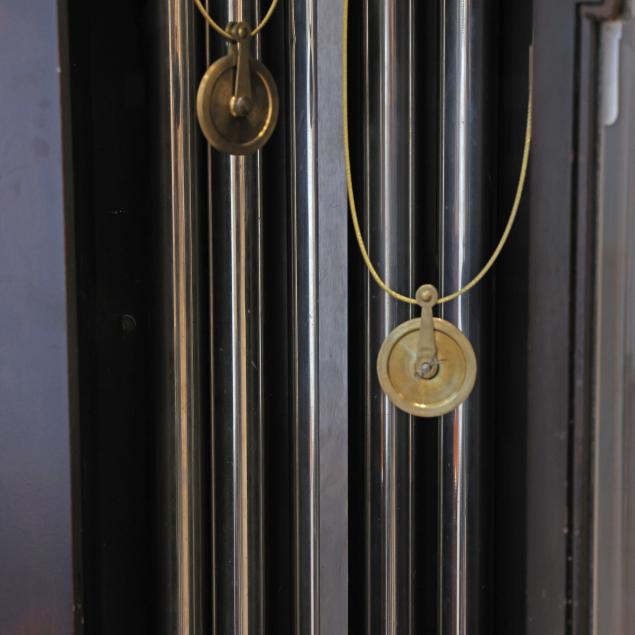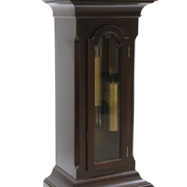 Made in Germany, early 20th century, in the Georgian taste, the ornate engraved silvered metal face with Herschede crown above a 12-1/4 in. round dial having Arabic chapters and subsidiary seconds dial, signed "TIFFANY & Co. / NEW YORK" with silent and chime option, upper lunette moon phase, dual weight driven eight day movement signed "HERSCHEDE" with crown and numbered "4063" and patent date "PAT'D JAN.12-09", within a Georgian style mahogany case, hood with broken arch pediment, three spire finials, and sides with round pierced scrollwork design, above a beveled glass case door flanked by chamfered corners, cove molded rectangular base with carved skirt and bracket feet, rear panel with numbered stamps. Includes pendulum, two weights, (5) tubular chimes, winding and case keys.