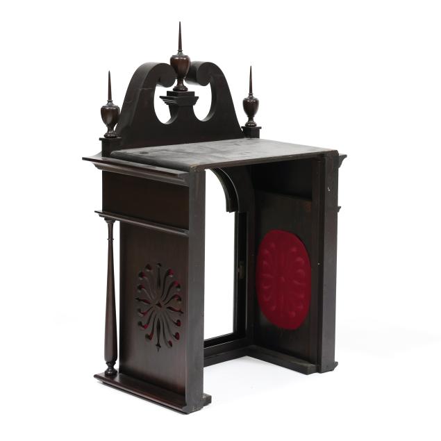 Good estate condition; crack and repair to front left foot and right pediment arch; cracks to finial spires; some spotting to metal face; a few small nicks to case edges. Please see Terms and Conditions of Sale: Clocks and Watches.