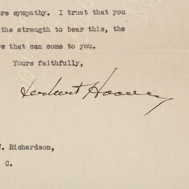 One page, letter of condolence from President Hoover on a single folded sheet, typed on White House stationary and dated August 27, 1929, writing to the widow of Charles W. Richardson of Washington, D.C. as follows: "My dear Mrs. Richardson: / I am distressed to learn of the death / of your husband and wish to extend to you my / deep and sincere sympathy. I trust that you / will be given the strength to bear this, the / greatest sorrow that can come to you. / Yours faithfully, / Herbert Hoover."