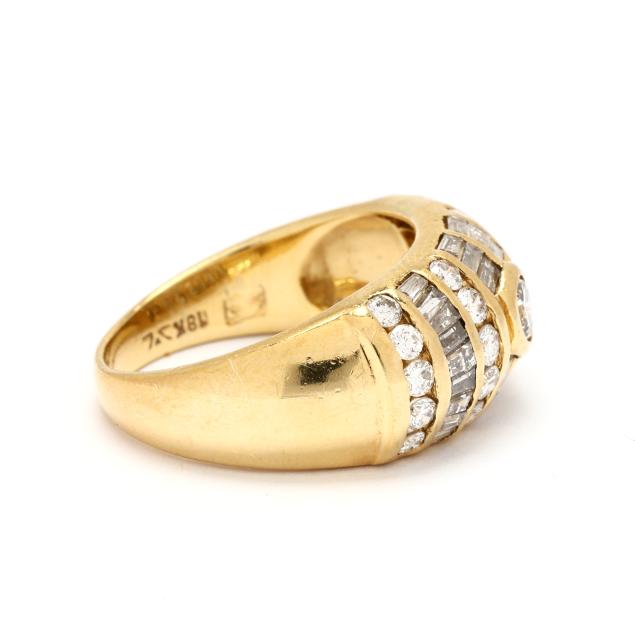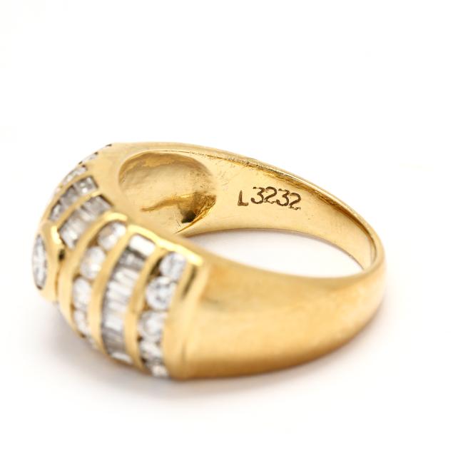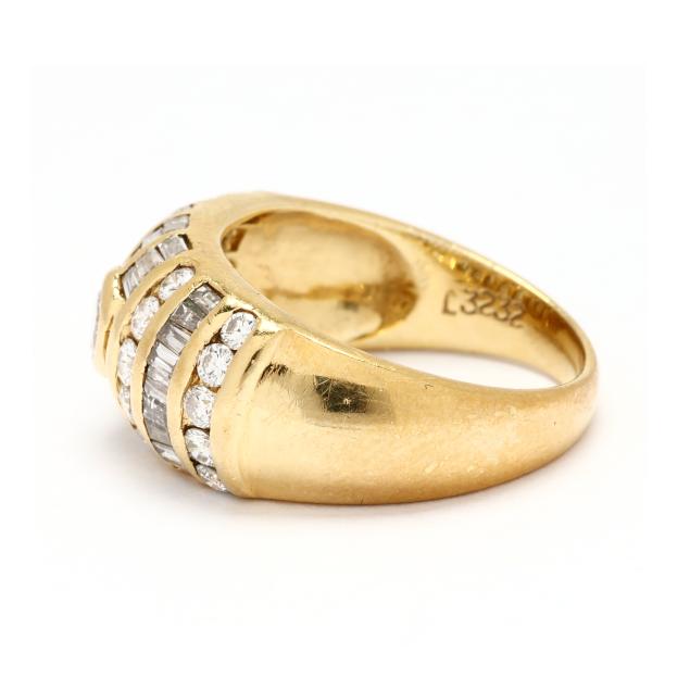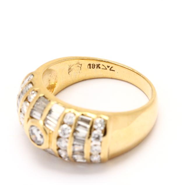 Centered on a bezel set full cut round diamond, and with channel set full cut round and baguette cut diamonds weighing approximately 1.30 total carats (H-I color, SI2-I1 clarity), stamped with maker's mark and 18K / L3232.