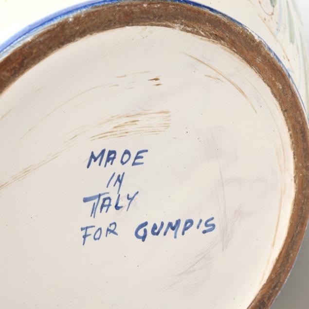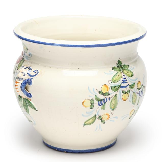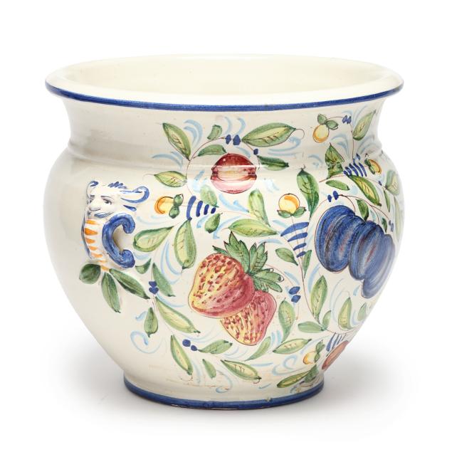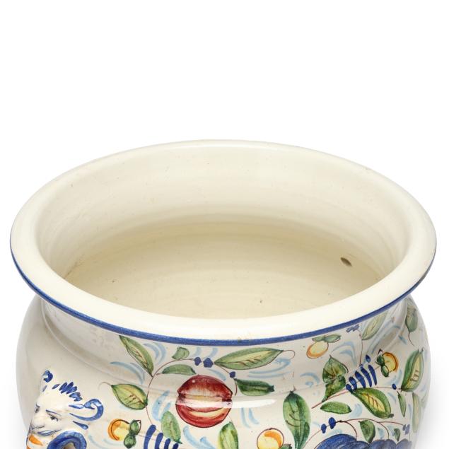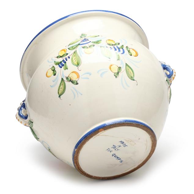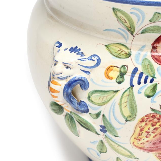 Italy, mid-late 20th century, tin glazed and hand-painted earthenware, made for Gump's (San Francisco), squat floor vase with two lion form handles and fruit and foliate decoration to body, marked "MADE/IN/ITALY/FOR GUMP'S" to underside.