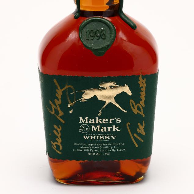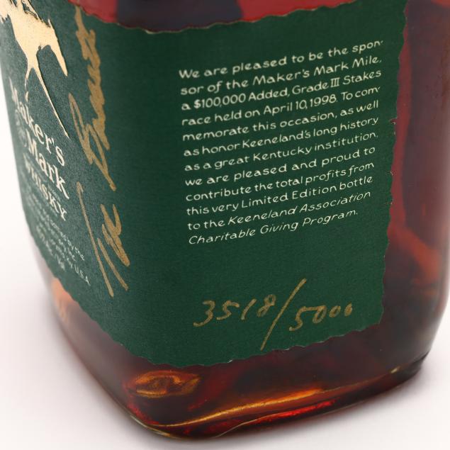 Vintage 1998, Maker's Mark Kentucky Straight Bourbon Whisky, Loretto, KY, 45%, limited release for Keeneland race track, bottle no. 3518/5000, appears to be signed by Bill Samuels (former CEO of Maker's Mark), Bill Greely (Former CEO of Keeneland) and Ted Bassett (former Keeneland president), into neck, sealed, wxc (1 750 ml)