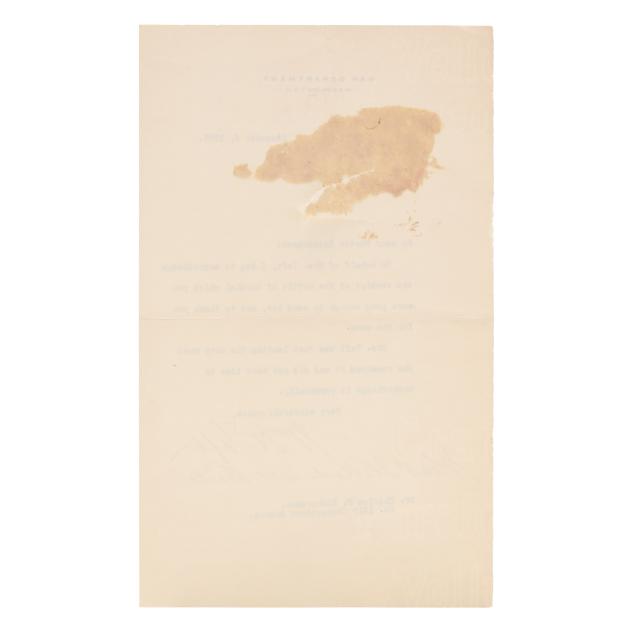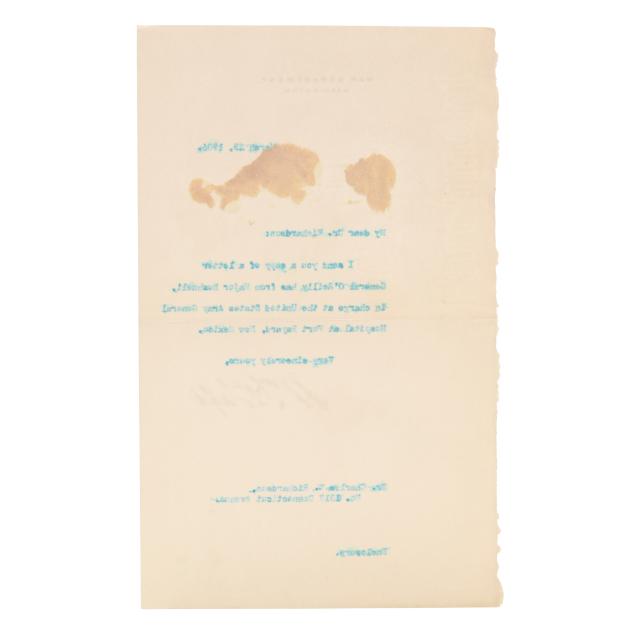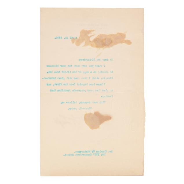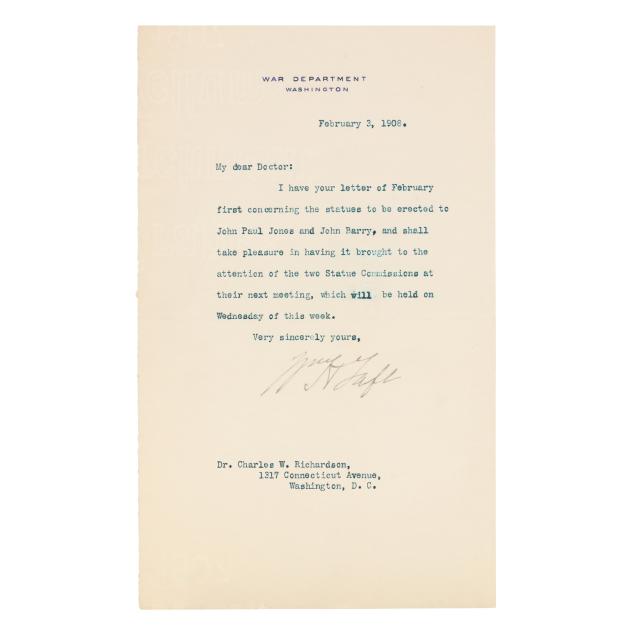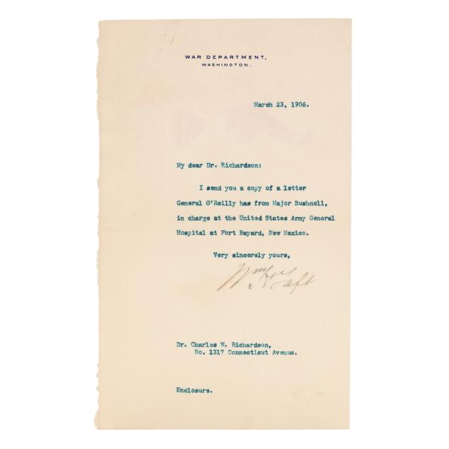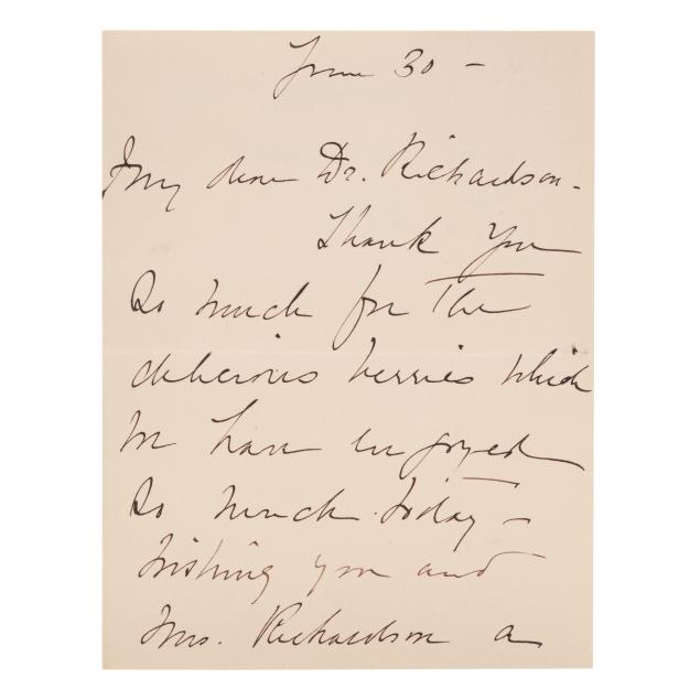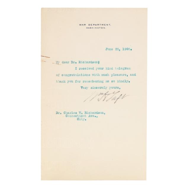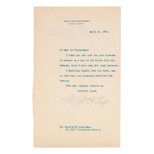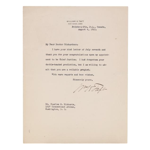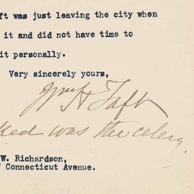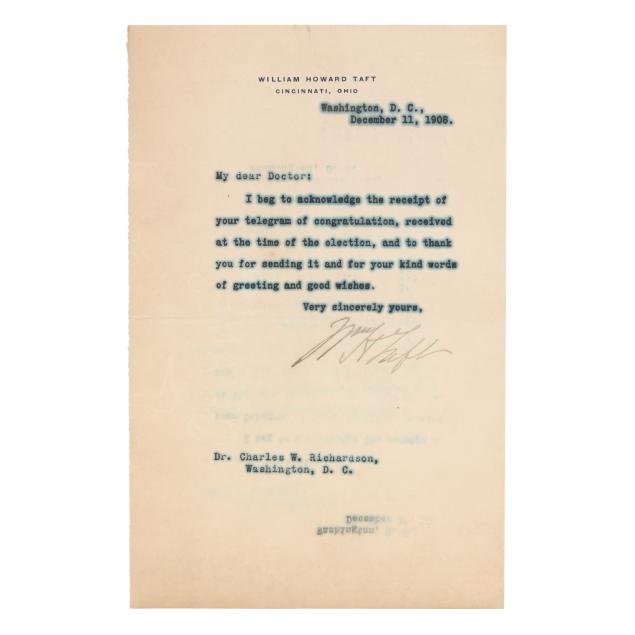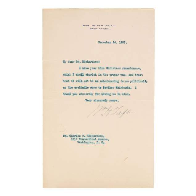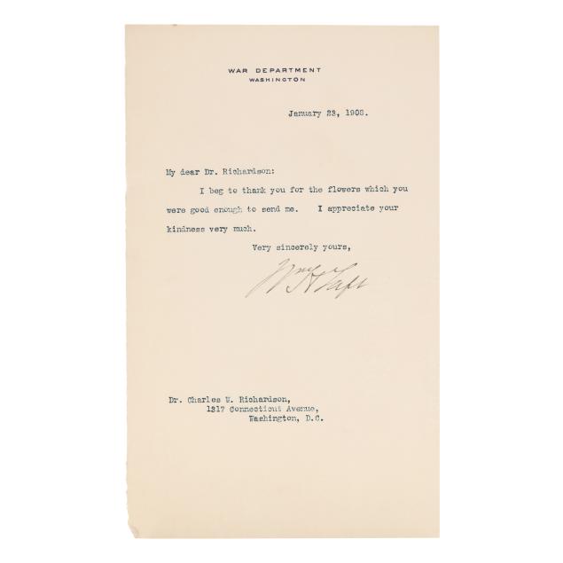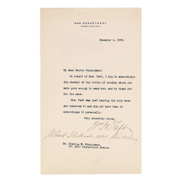 (10) letters, all addressed to Dr. Charles W. Richardson in Washington, D.C., including: (7) one-page TLS on War Department letterhead, 1905-1908, with many being notes of thanks for gifts, one with the additional hand-written note following a typed thank you for a bottle of cordial, "What I liked was the celery," and one regarding two D.C. statues; a one-page TLS on Taft's personal Cincinnati, Ohio letterhead, dated December 11, 1908 and written from Washington, D.C., thanking Richardson for congratulating him on winning the November 1908 election; a one-page TLS on Taft's personal New Haven, CT letterhead, dated August 4, 1921 and written from Pointe-au-Pic, Quebec, Canada, thanking Richardson for congratulating him on his appointment to be Chief Justice of the Supreme Court earlier that summer; and one ALS from Helen Taft, a note of thanks dated June 30th; all signed.