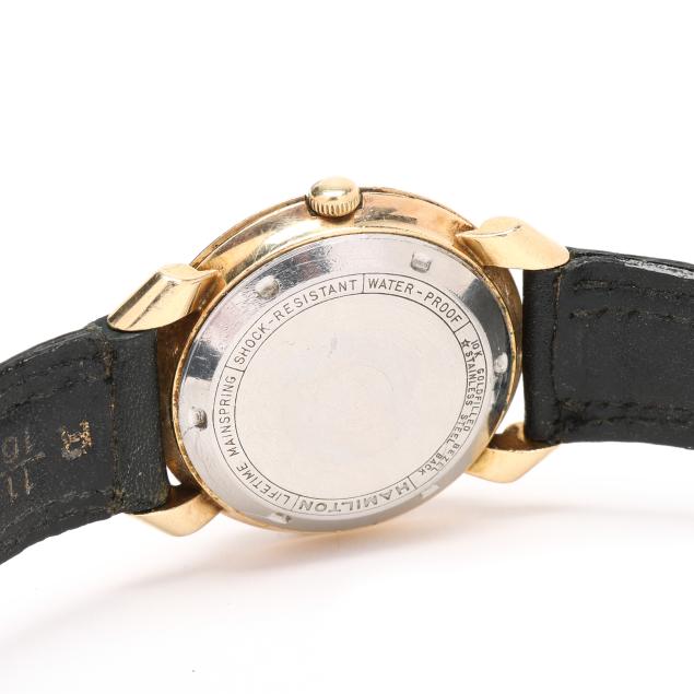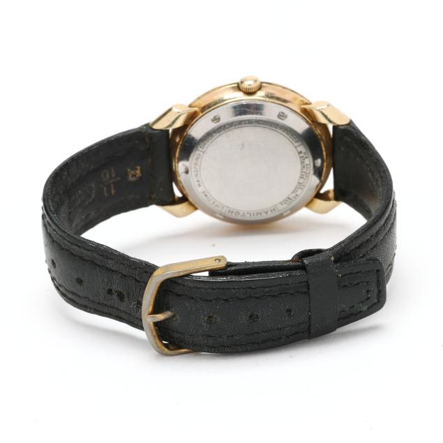 Circa 1956, automatic, Hamilton 661, serial number R634287, the round gold-filled case with polished bezel, the silver-tone dial with gold Arabic numeral and arrow hour markers, gold dagger minute hand, and center time zone dial with black hour hand in 'Eastern', the black leather strap with gold-tone buckle, the signed stainless steel caseback stamped 10K Goldfilled Bezel / Stainless Steel Back.