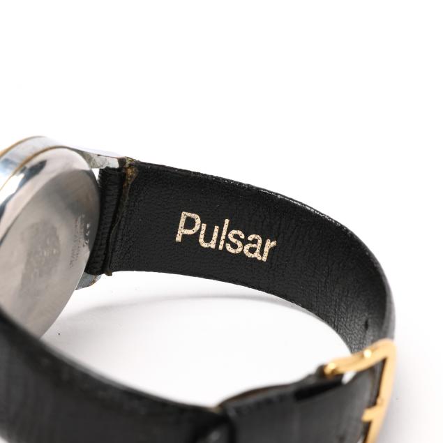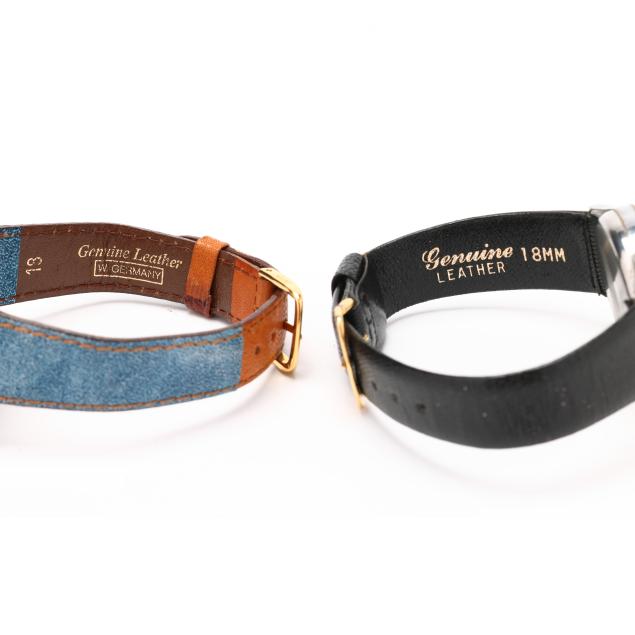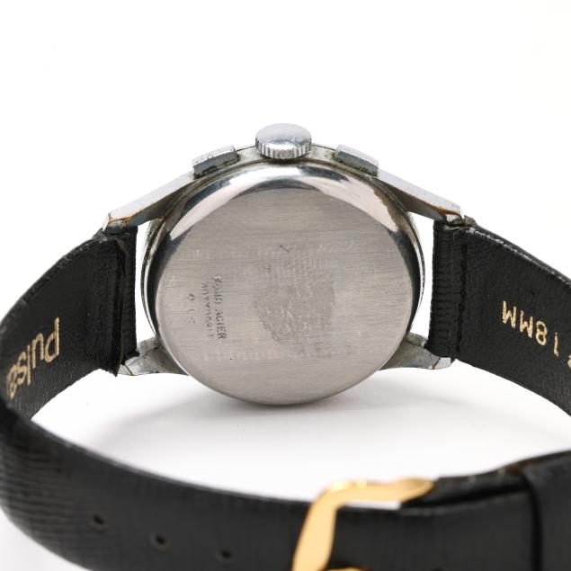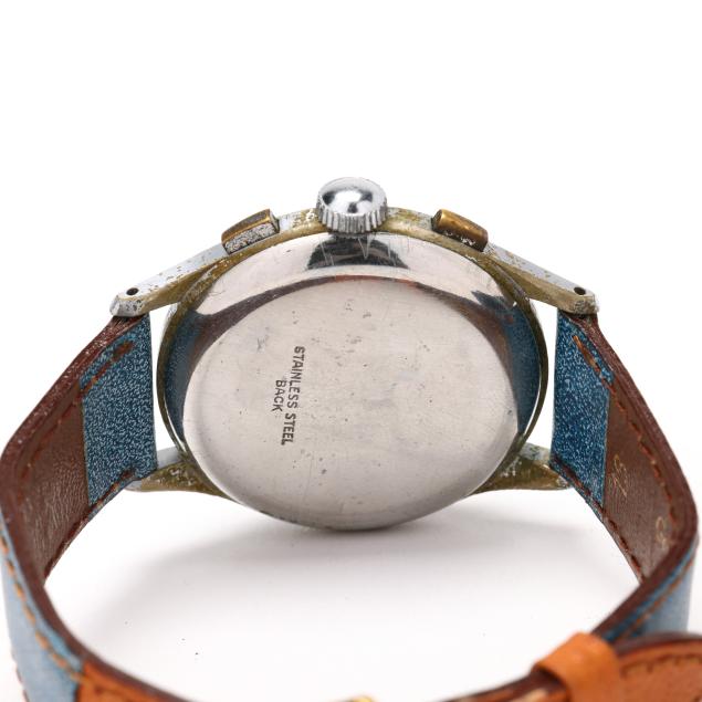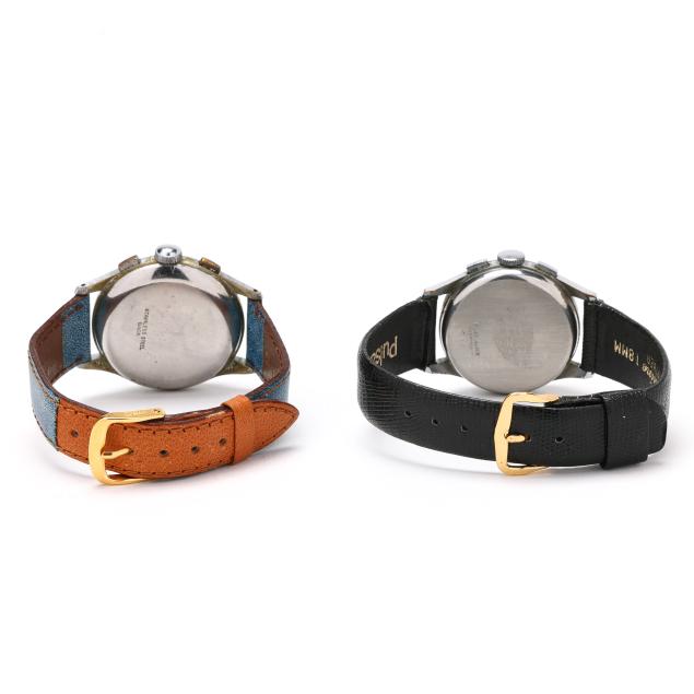 To include: a watch by Helbros, manual wind, Venus 170, the round stainless steel case with polished bezel, the signed gold-toned dial with Arabic numeral hour markers, blued steel baton hands, subsidiary chronograph dial at 12:00 hour, subsidiary second dial at 6:00 hour, and telemeter and tachymeter outer registers, the blue and brown leather strap with gold-tone buckle, the caseback stamped Stainless Steel / Back (Case 35.5mm; 8.5 in.) (Pitting and scratching to case and pushers; running at time of examination); and a watch by Chronographe Suisse for Sheffield, manual wind, Landeron 48, movement signed Britix Watch Co, the round stainless steel case with polished bezel, the double signed cream-colored dial with gold-tone Arabic numeral hour markers, gold-tone dagger hands, subsidiary second dial at 9:00 hour, subsidiary chronograph dial at 3:00 hour, and tachymeter and telemeter outer registers, the black leather strap signed Pulsar and completed with gold-tone buckle, the caseback stamped Fond Acier / Inoxydable / 245 (Case 33mm; 8.25 in.) (pitting and scratches to case and bezel; scratches to crystal; running at time of examination).