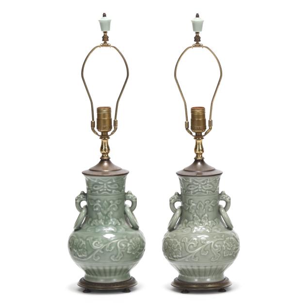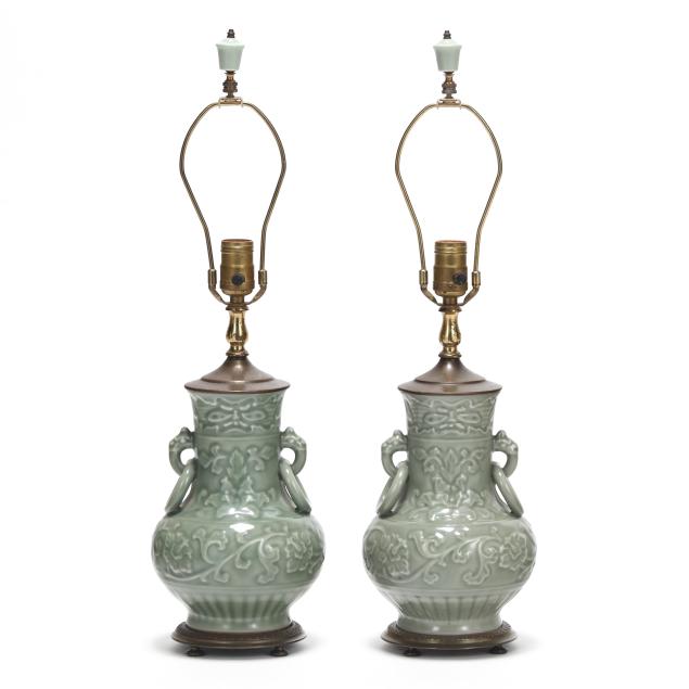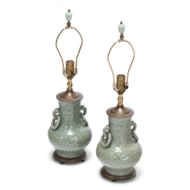 20th century, celadon glazed pear shaped vases with molded peony decoration above lotus petal border above foot, the neck of each vase is flanked with elephant head handles holding rings, both vases drilled and fitted with patterned metal mounts and having a single lightbulb fitting, each with stone finials at the top of harp, come together with shades.