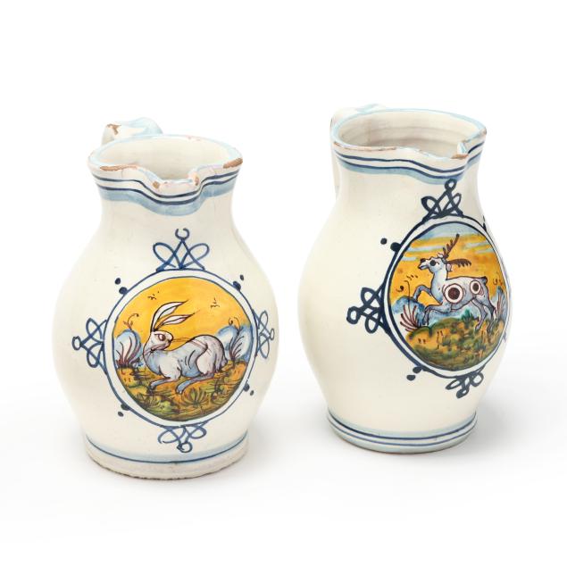 Early-mid 20th century, tin glazed and hand-painted earthenware, each with animal vignettes within upper and lower banded borders, one stamped "MADE IN ITALY" to underside.