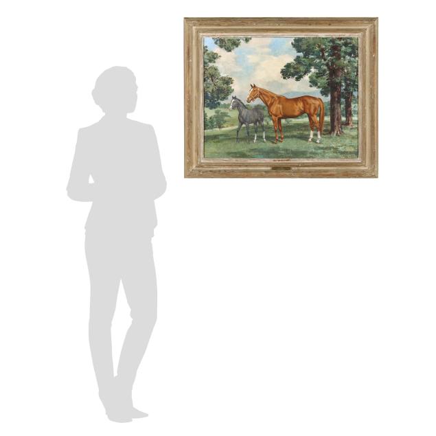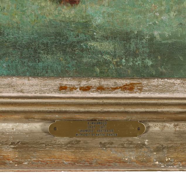 Oil on canvas, signed at lower left, presented in a carved frame with gallery plate at lower center "Almahmoud / 1947-1971 / 'Mahmoud-Arbitrator / With Colt by Native Dancer."