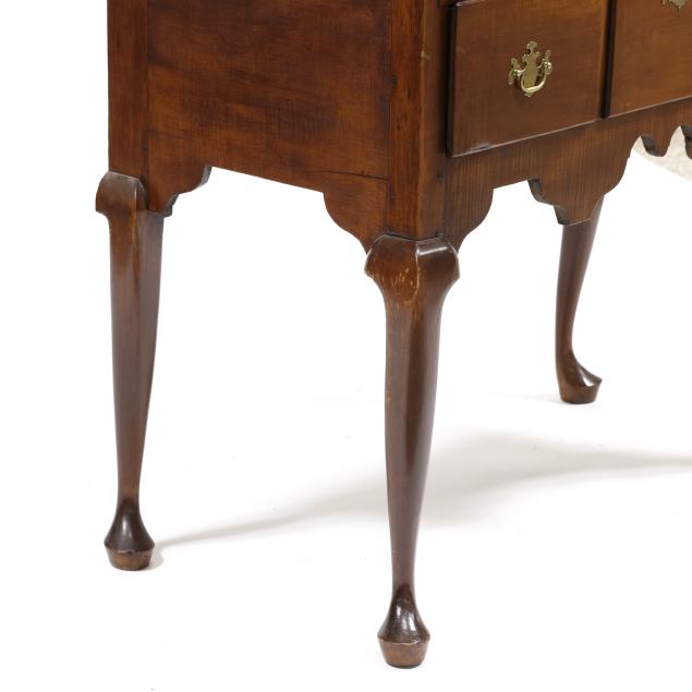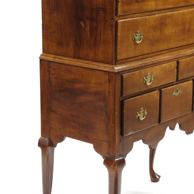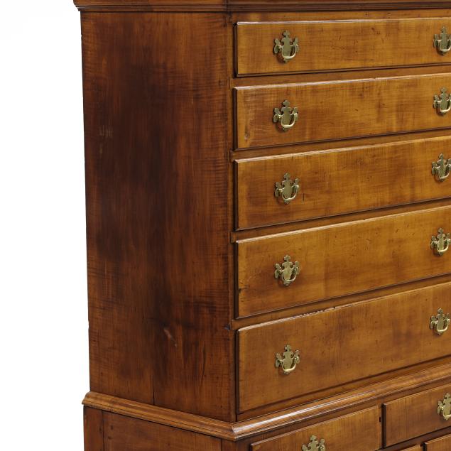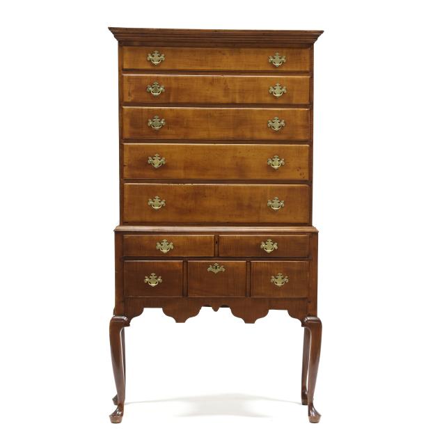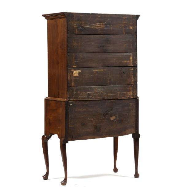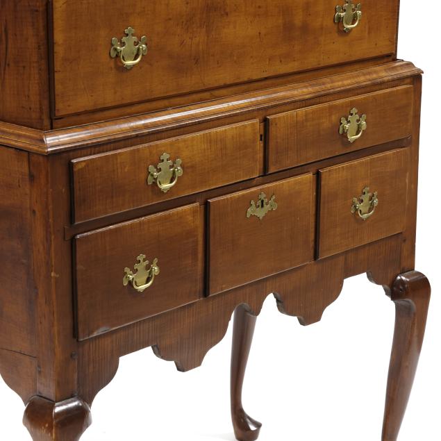 Circa 1760-1770, white pine secondary, two part form, dovetailed case with applied molded cornice, four graduated molded lipped drawers with open horizontal drawer stile, the base with applied edge molding over two graduated lipped drawers both with faux form suggesting a two-over-three, deeply scalloped skirt, tall cabriole legs, raised pad foot.