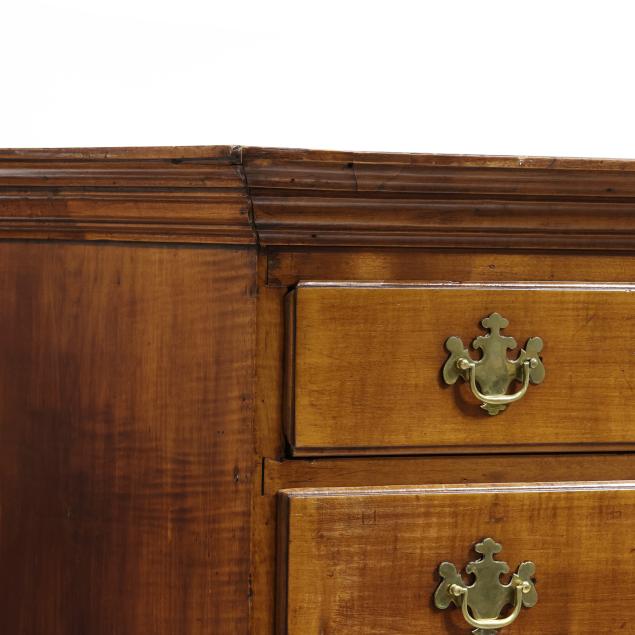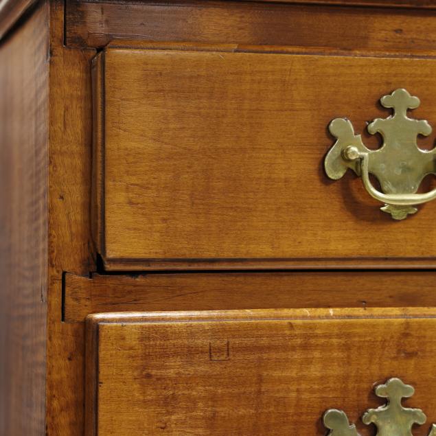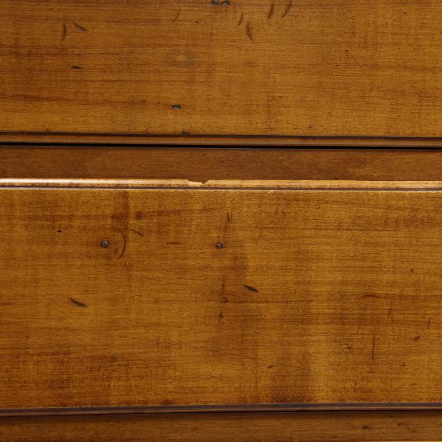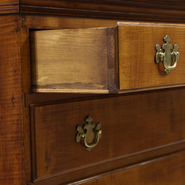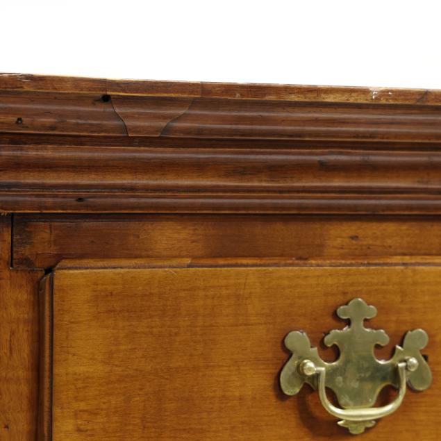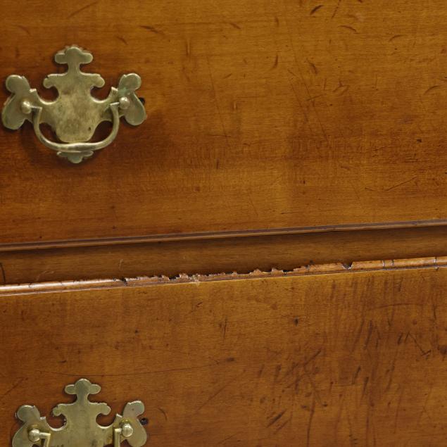 Later pulls; some original pull holes exposed; some drawer runners rebuilt; some drawer molding minor loss especially at corners; shrinkage split to the upper left and right case sides; missing drop finials at skirt.