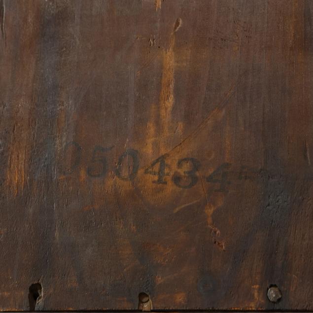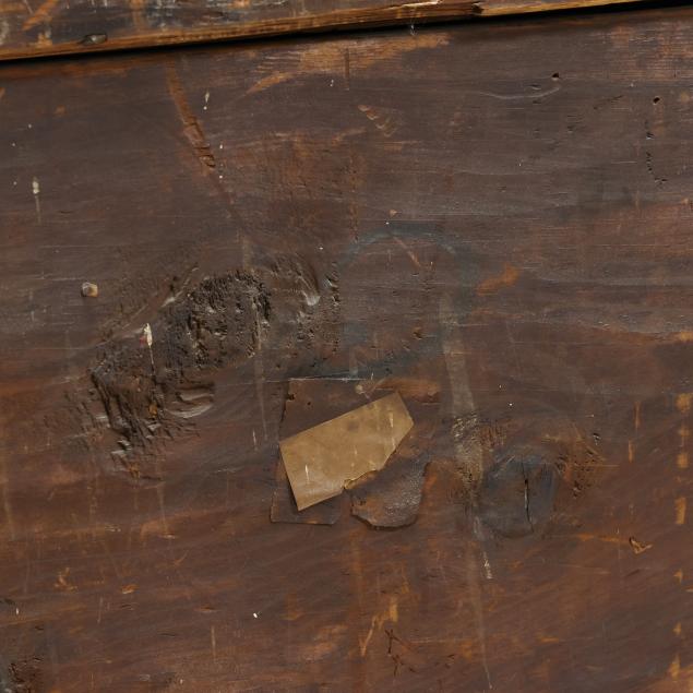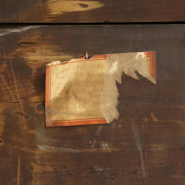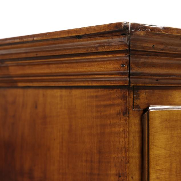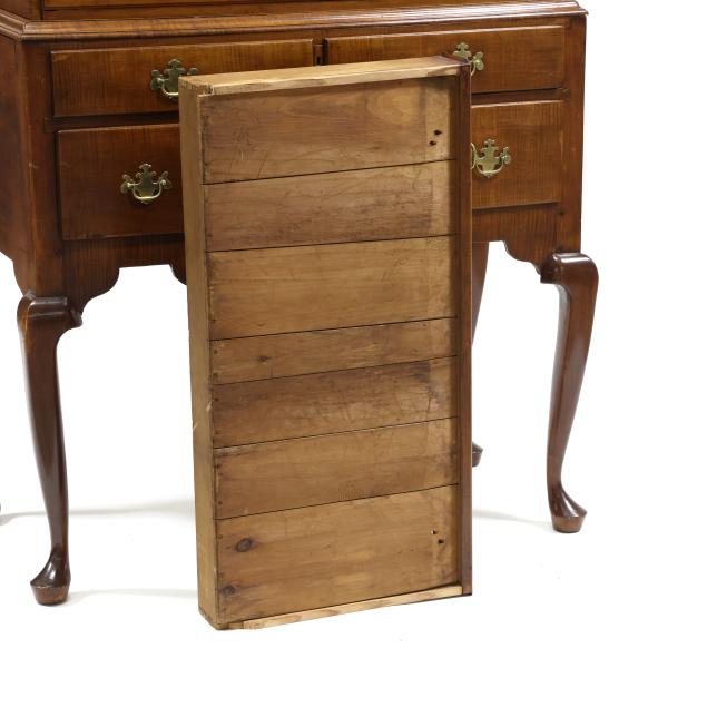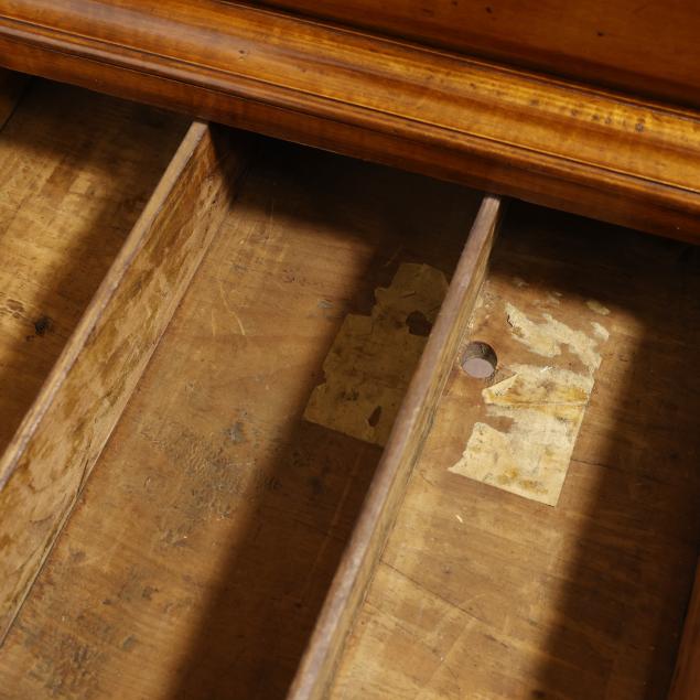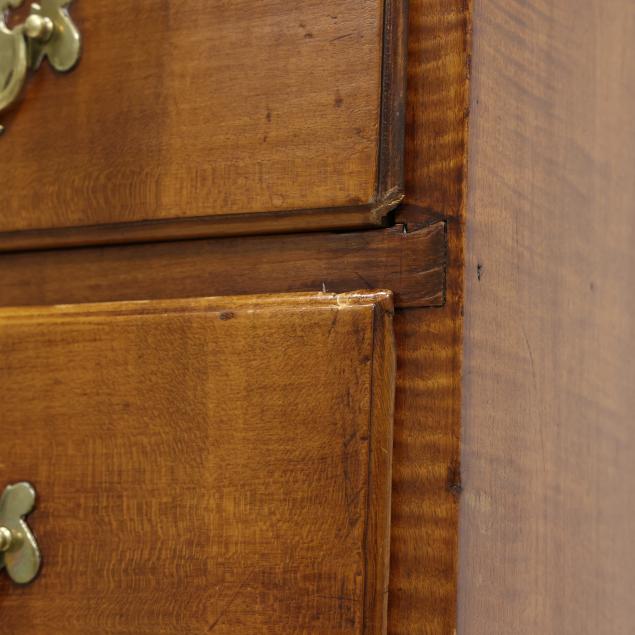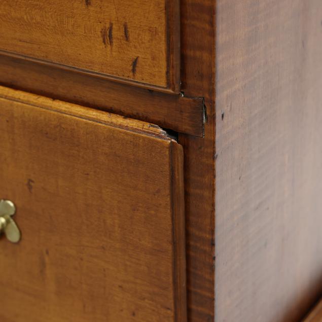 Remnant of paper label to the inside top faux drawer; back side with two illegible labels; some black ink numbering to back; a good original example with areas of pronounced tiger maple.