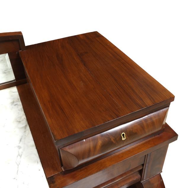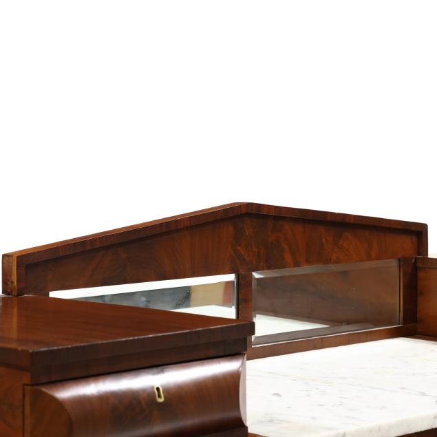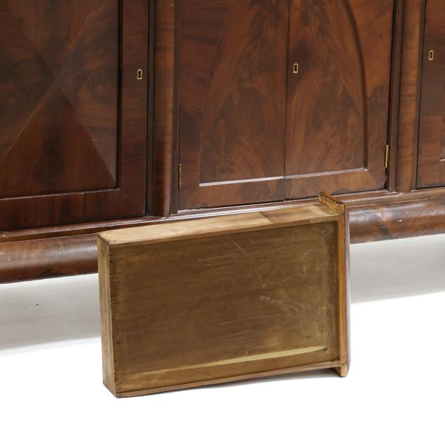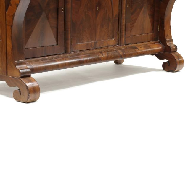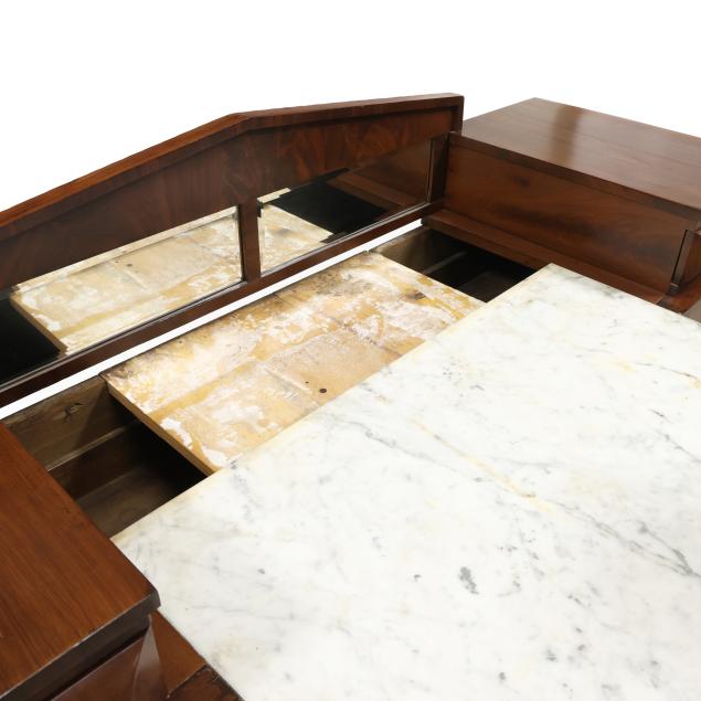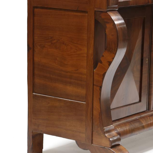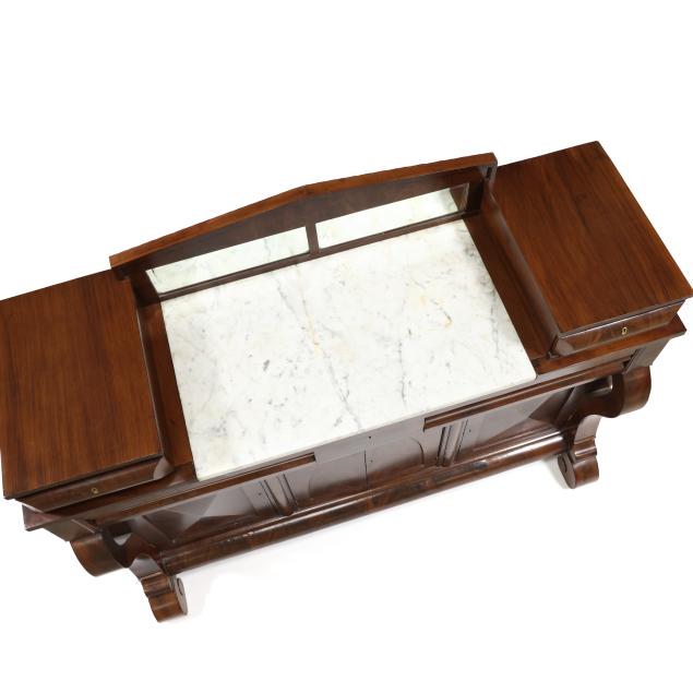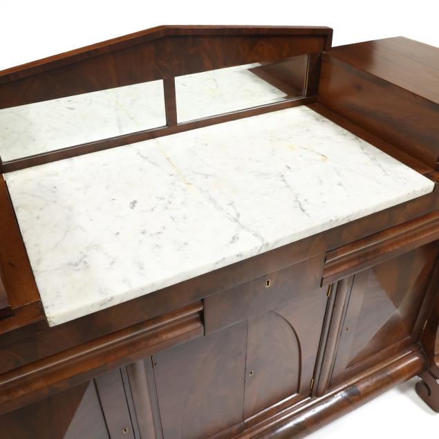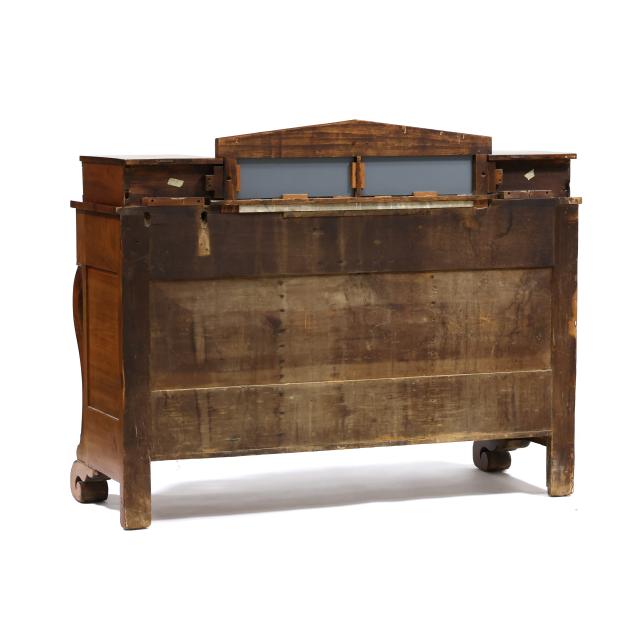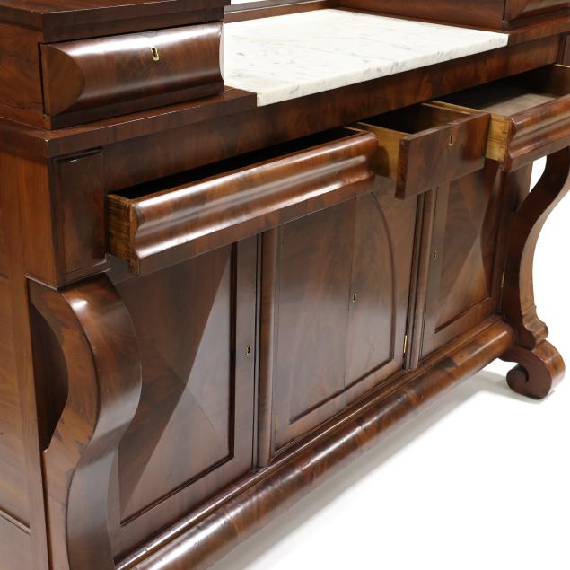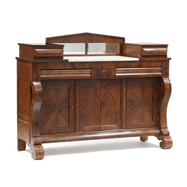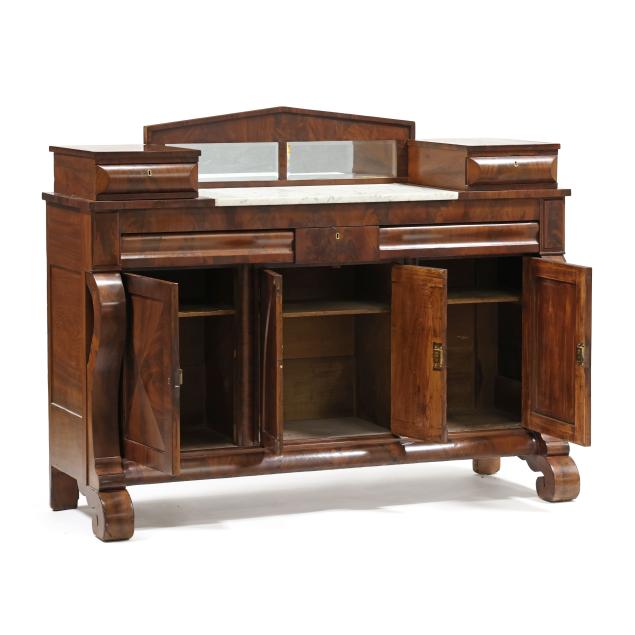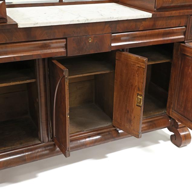 Caswell County, North Carolina, circa 1840, multi-part form, mahogany veneer, poplar, yellow pine and deal secondary, rectangular form featuring a recessed pitched backsplash supporting two beveled mirrors, central inset marble top flanked by two convex drawers, the case featuring three side by side upper drawers, the left and right ogee form, above a central cabinet featuring two hinged doors with a Gothic arched panel, flanked by two large cabinet doors each with a distinctive raised panel, the central two stiles with slight convex molding, paneled sides, the left and right and with bold scrolled stiles, bold and scrolled front feet.