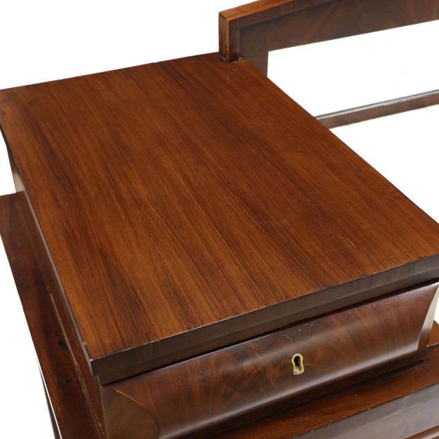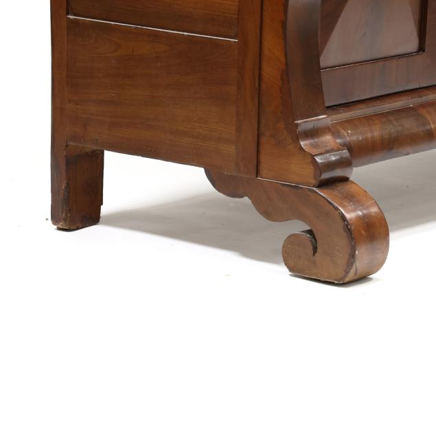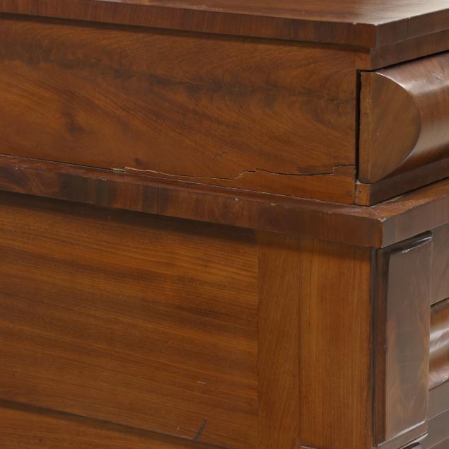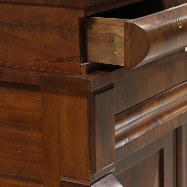 From the Estate of the late Mr. and Mrs. R.D. & Annie Fuquay of Caswell County, North Carolina Multiple repairs including later beveled mirrors; missing and replaced locks; later hinges; veneer patching and coloring especially at the stiles and lower convex skirt; later faux grain paint to two top surfaces.