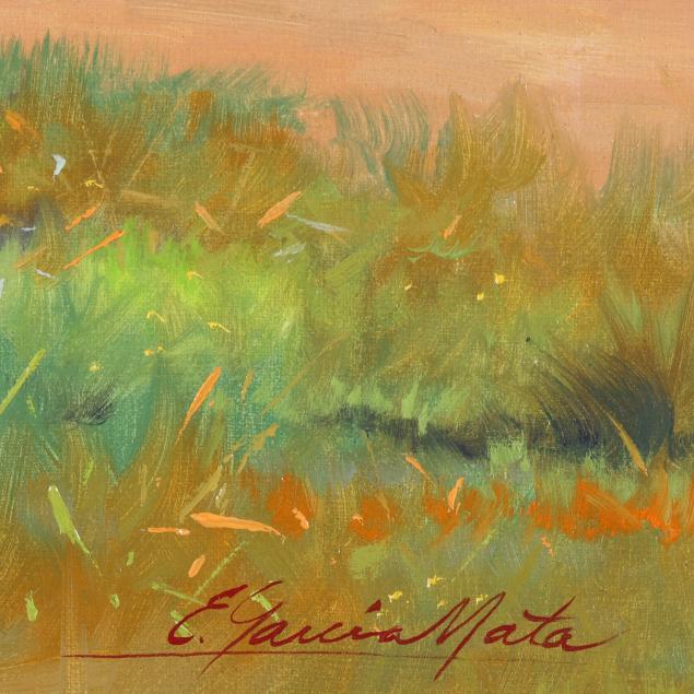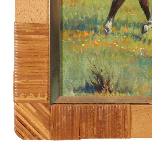Oil on canvas, signed at lower right, presented in a custom rivercane wrapped frame.