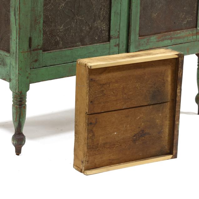 Attributed to Rockingham County, mid 19th century, cherry with old green painted surface, white pine secondary, the rectangular case featuring a top with double beveled edge, two upper side by side drawers above two hinged cabinet doors, each with three repeating punched tins featuring a central star and quarter fans, shelved interior, three repeating punched tins to case sides, raised on tall turned distinctive legs.