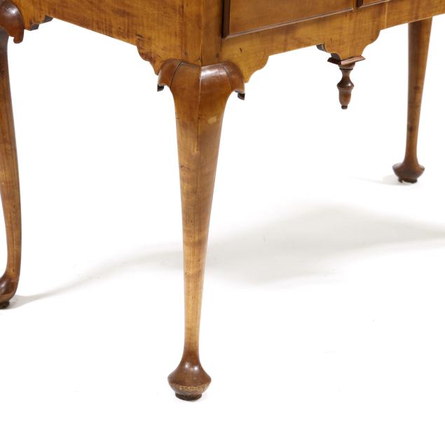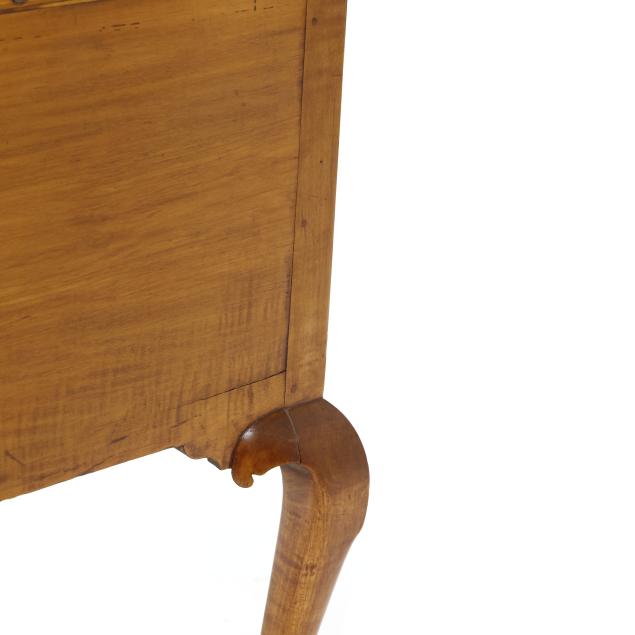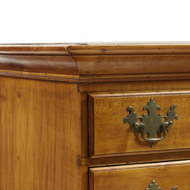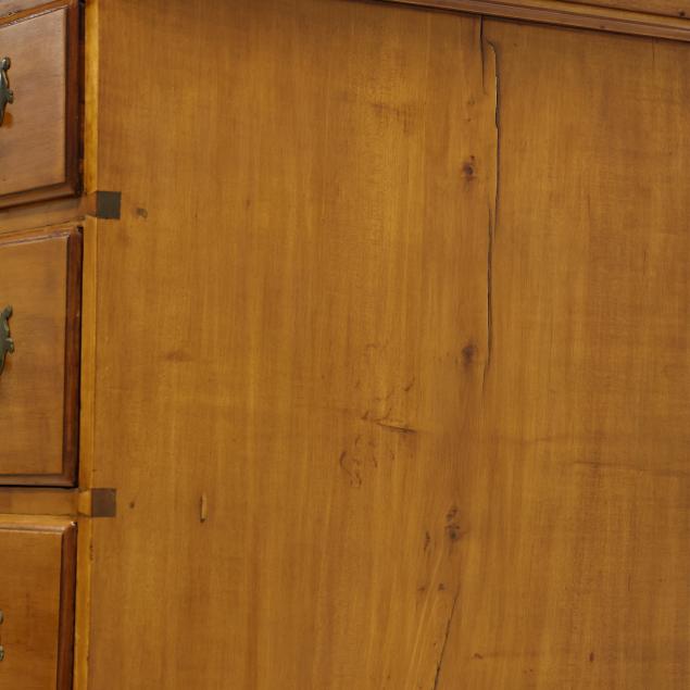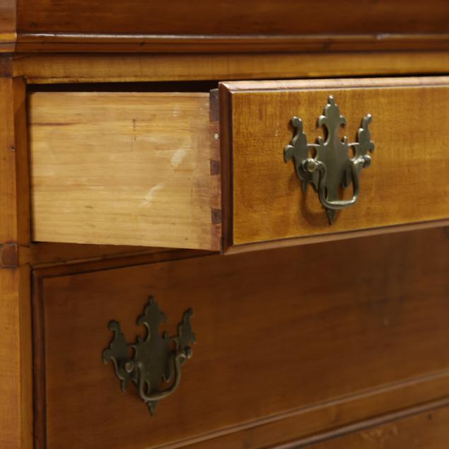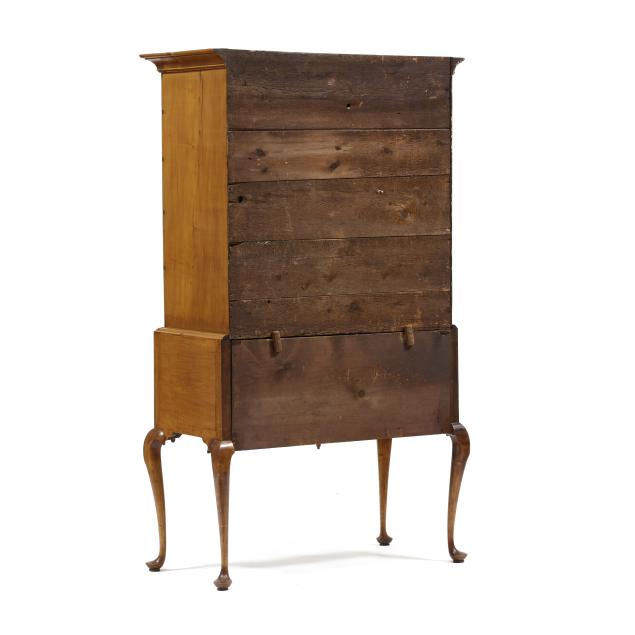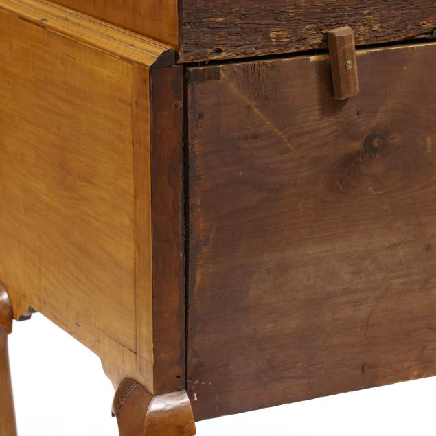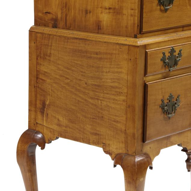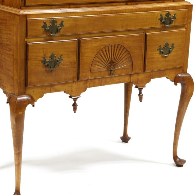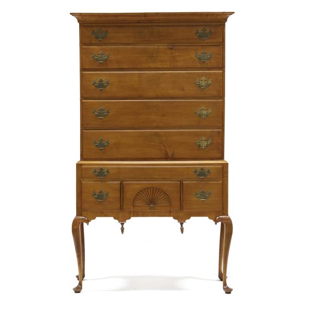 Mid 18th century, white pine secondary, two-part form, upper case with applied cove molded cornice, five graduated lipped drawers, base with applied molded upper edge above a single long drawer above three side-by-side drawers, the central with relief carved fan, shaped skirt with two acorn drop finials, raised on tall cabriole legs with a carved notched knee return on pad feet.