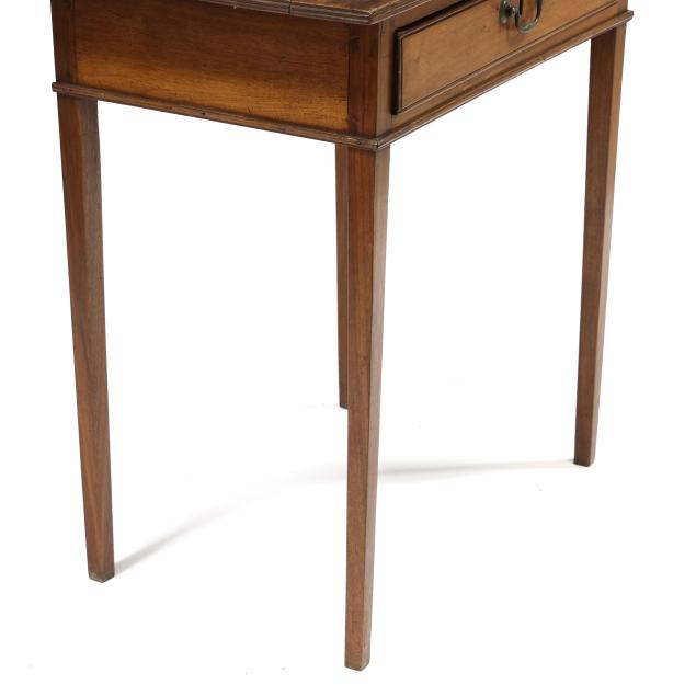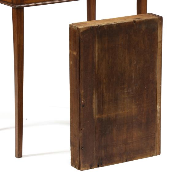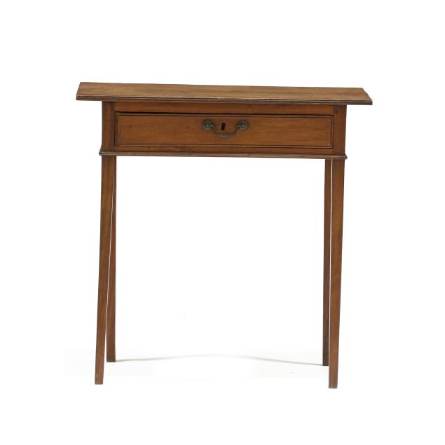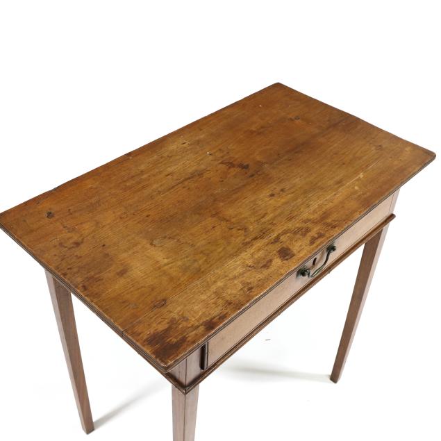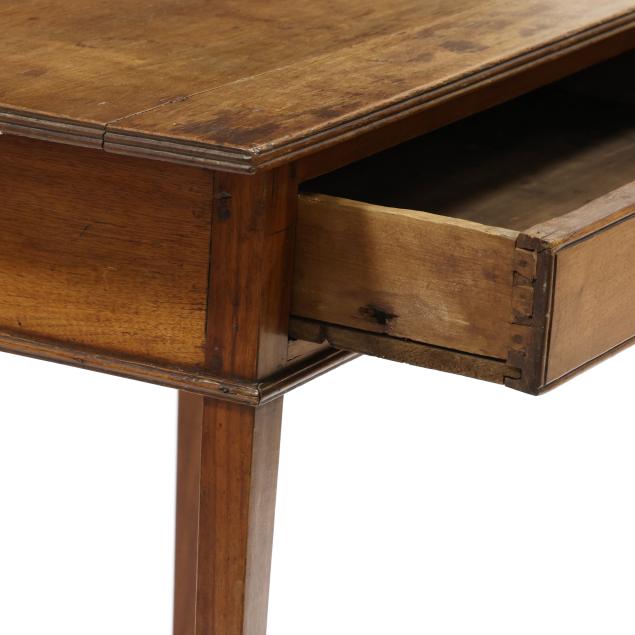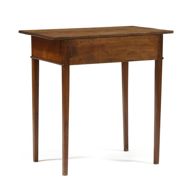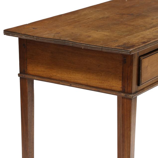 Attributed to Petersburg, circa 1800, poplar secondary, the rectangular table featuring a reeded edge to the top board, single flush drawer with scratch bead, applied molded trim to bottom edge of skirt, tall square tapered legs.