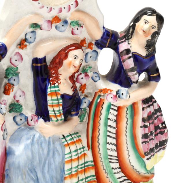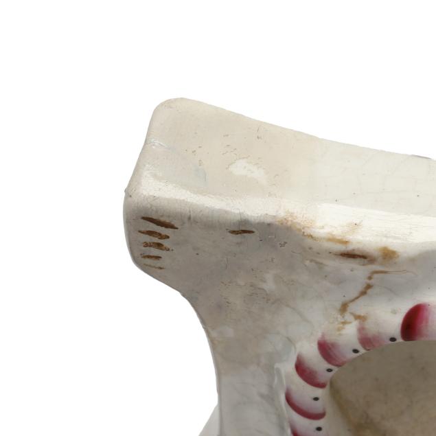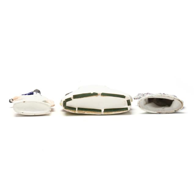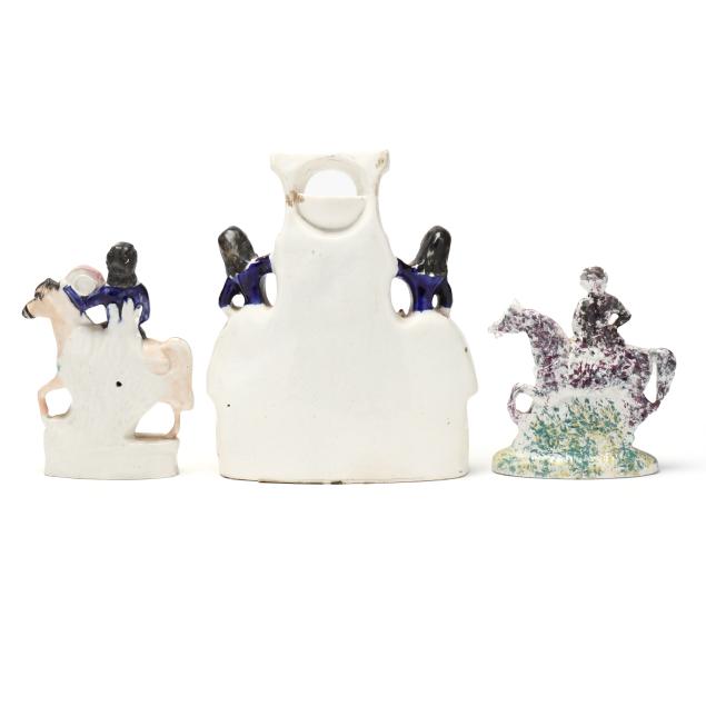 England, mid-late 19th century, hand-painted and gilt pearlware, including a pocket watch holder featuring the Three Graces; a spongeware woman astride a horse; and a boy astride a horse, all unmarked.