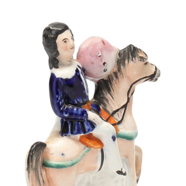 From the Estate of the late Peggy Augustus, Old Keswick, Virginia Possible repair to one Grace's nose, break and repair to left corner of watch frame, hairline with associated chip to right side of watch frame, hairline and fleabite to base; chip to spongeware horse's ear and woman's hat; firing hairline to boy's neck, scattered small paint flakes to horses head, and small firing hairlines boy's leg and boy astride horse.