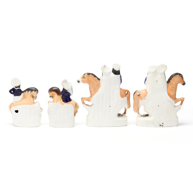 England, mid-late 19th century, hand-painted pearlware, to include a couple going to and returning from market, one misspelled "GOING TO MARKTE" and the other "RETURNING HOME" to base, both with painted marks to underside; and a pair of figures with feathered hats astride leaping horses, unmarked.
