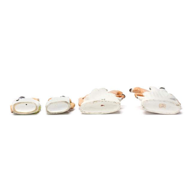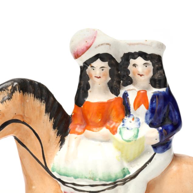A few minute areas of paint loss to all; nick to feathered hat, hole and firing crack to posterior of boy astride horse; some hairlines to girl astride horse; small areas of staining to hats and hairlines to base and undersides of both couples.