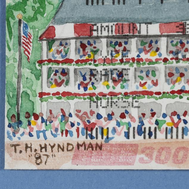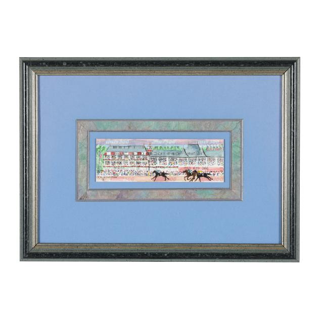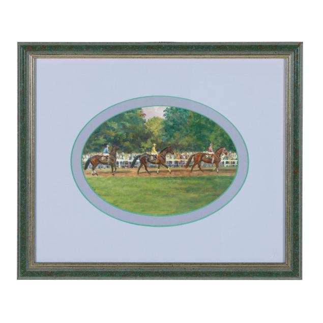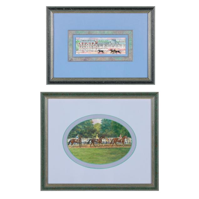 The first, Thomas H Archer (American, 1931-2016), oil on paper scene of racehorses and jockeys walking on the track, signed at lower right, framed in an ovoid mat below glass; the second, T. H. Hyndman (American), painting of a horse race and stands, watercolor on ticket, 1987, signed and dated to lower left, matted and framed below glass.