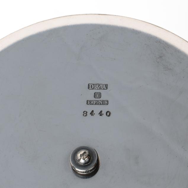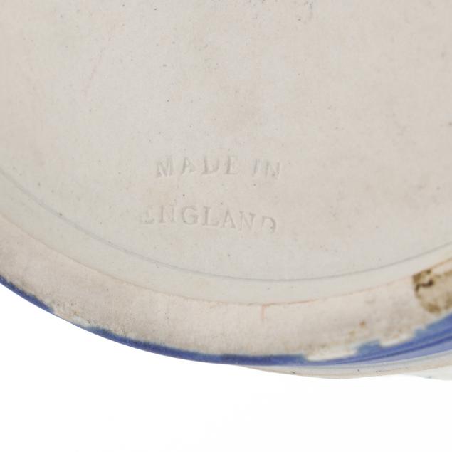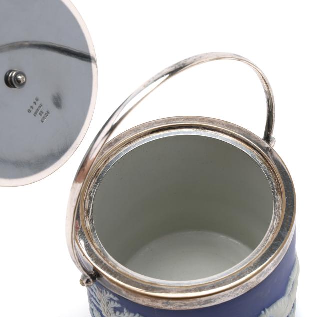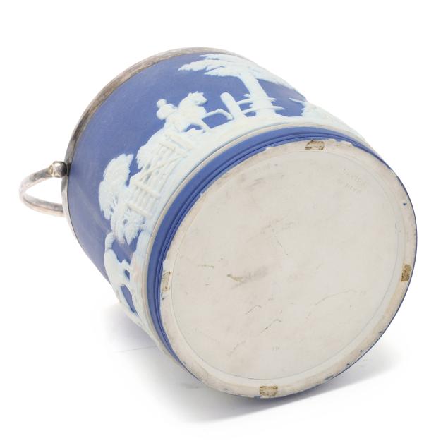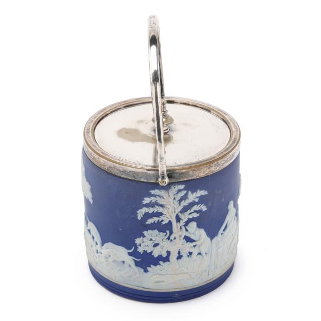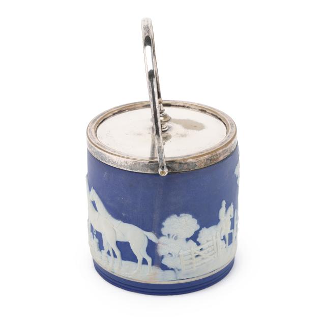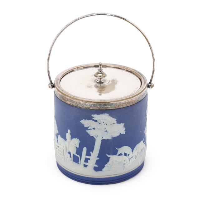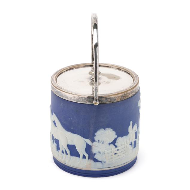 England, early 20th century, barrel with bas-relief hunting scene with horses, masters, and hounds, impressed "WEDGEWOOD / MADE IN ENGLAND" to the underside, mounted with silver-plated trim, handle, and lid, struck with mark of Daniel & Arter of Birmingham, pattern 8440.