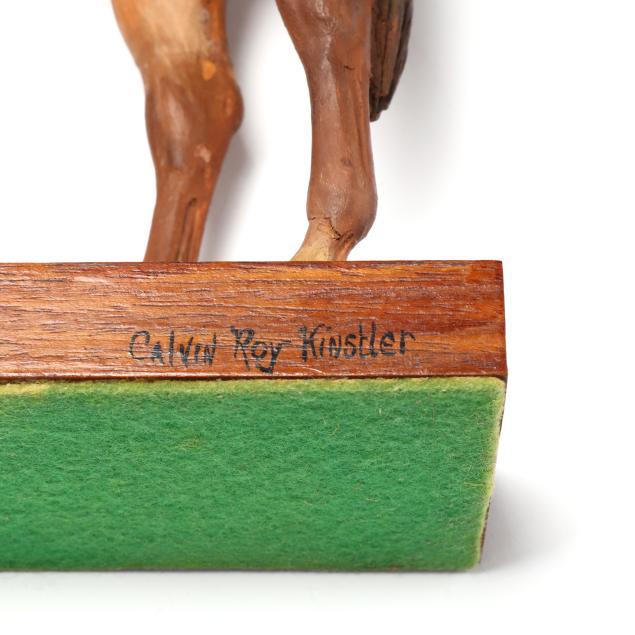 Calvin Roy Kinstler was from Baltimore, Maryland, and was primarily a wood sculptor of animals. His works were reproduced in bronze and Royal Copenhagen china. Apparently he was under contract with Abercrombie and Fitch for a period during the 1940s.