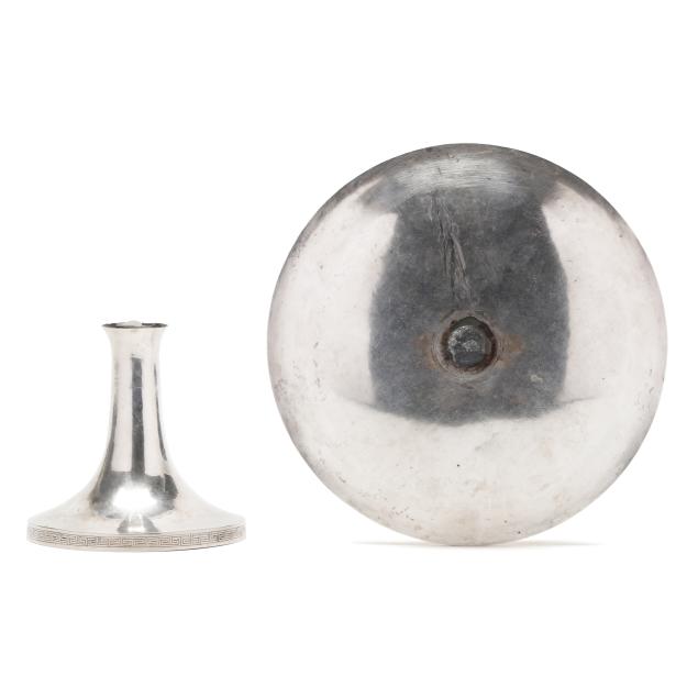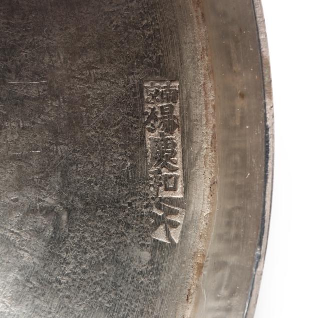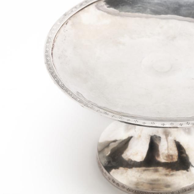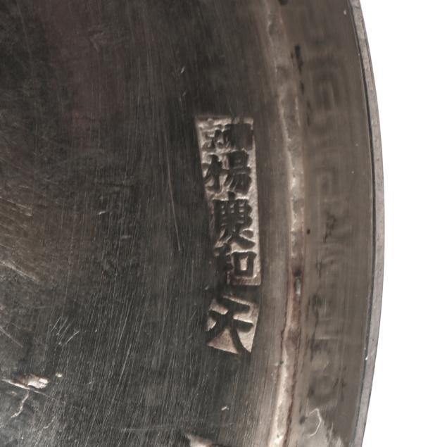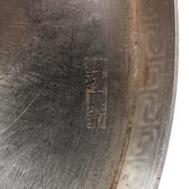 20th century, XRF tests 90% silver, featuring Greek key patterning to the rims, with four character and one character marks to the undersides, not monogramed.