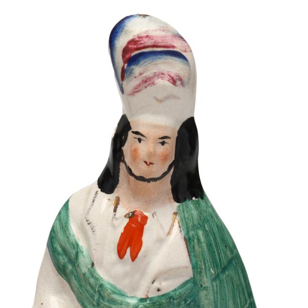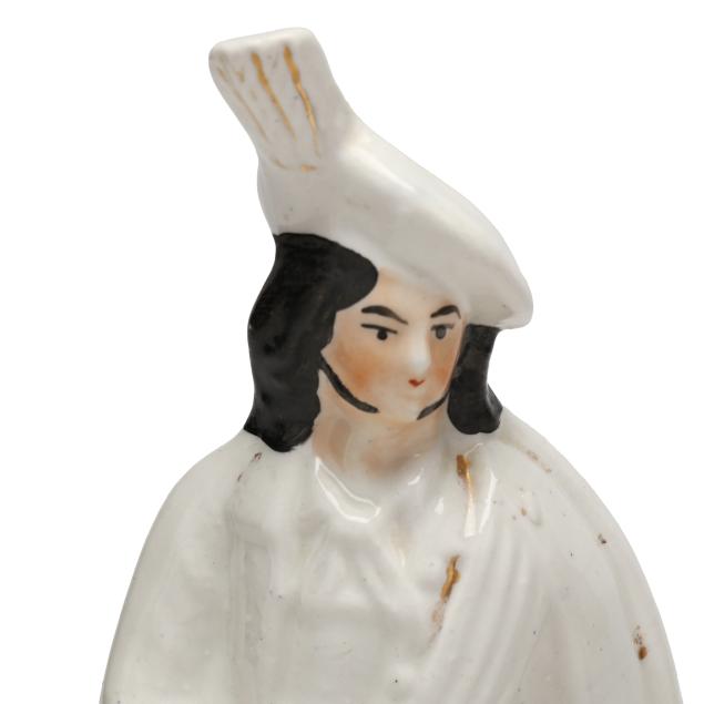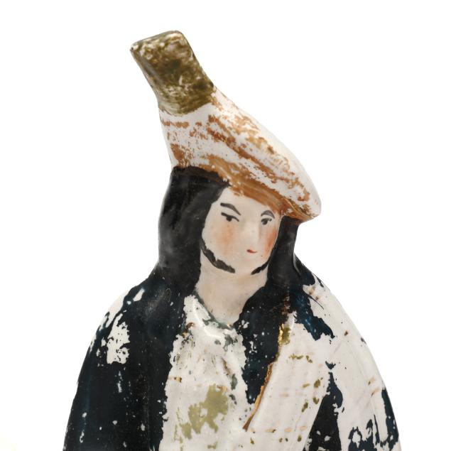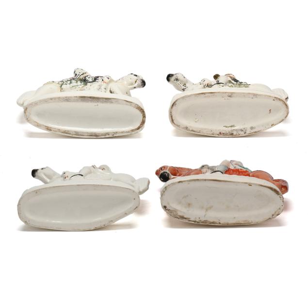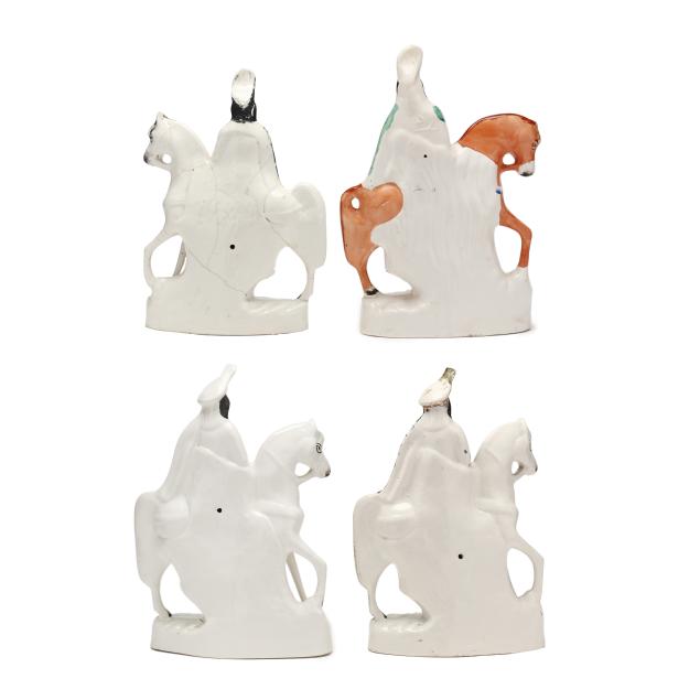 England, mid-late 19th century, hand-painted and gilt pearlware flatback figures of (4) highlander hunters, one with raised "X" and line mark to posterior and underside, possibly a registration mark.