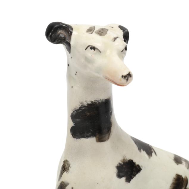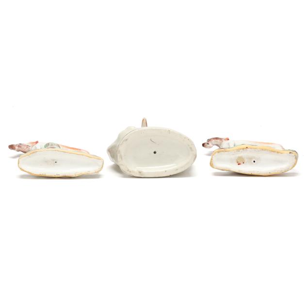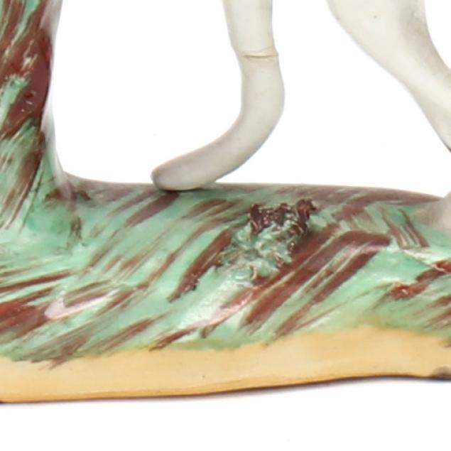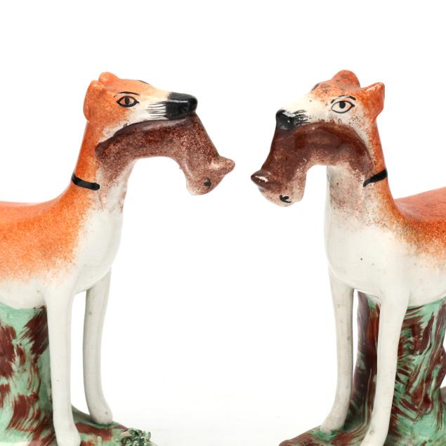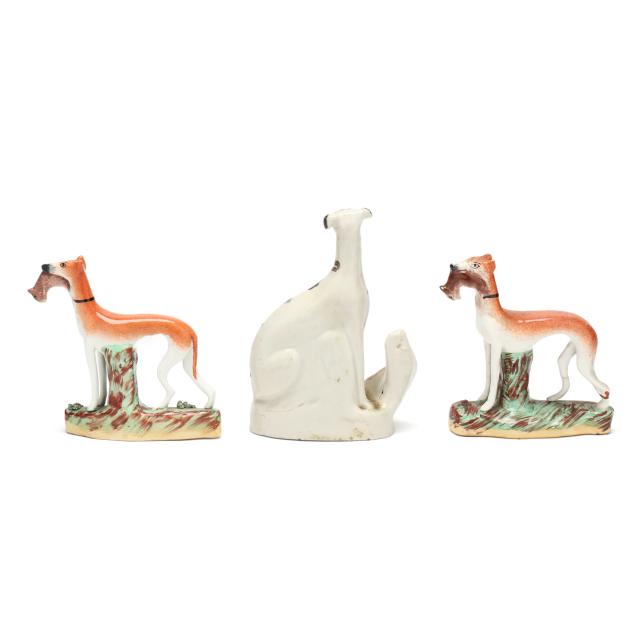 England, second half 19th century, unsigned, hand-painted pearlware modeled in the round, the first a seated 'Disraeli' greyhound with hare presented on a stump (7 1/2 in.); and a pair of standing whippets presenting a hare in their mouths, over a variegated stump base (tallest 6 in).