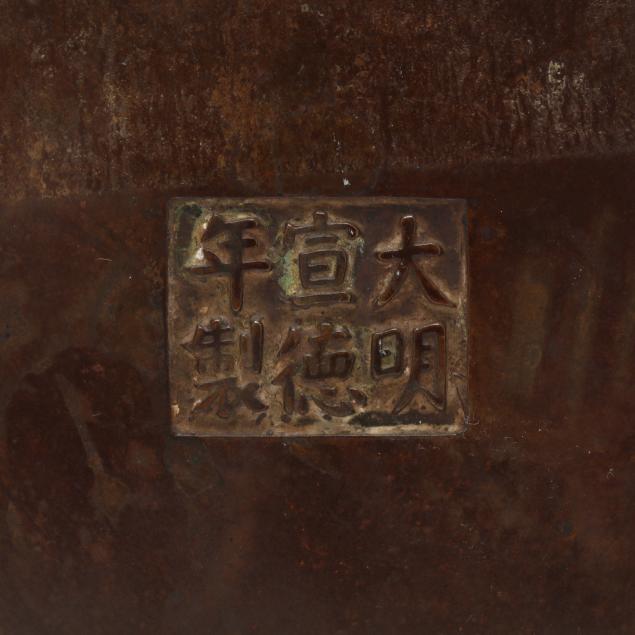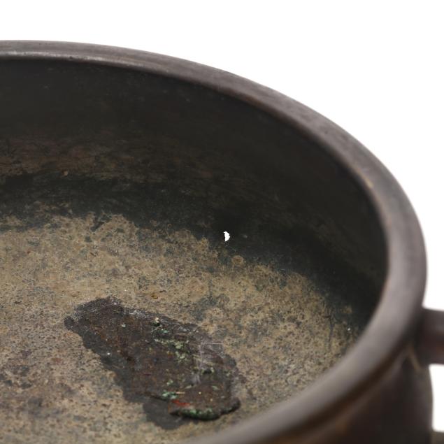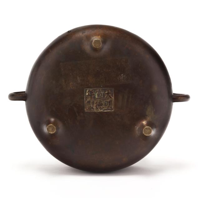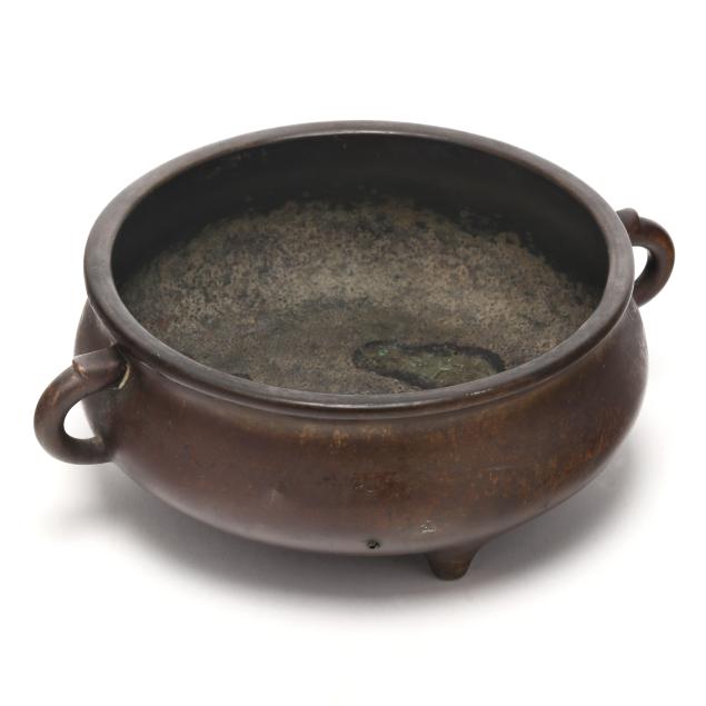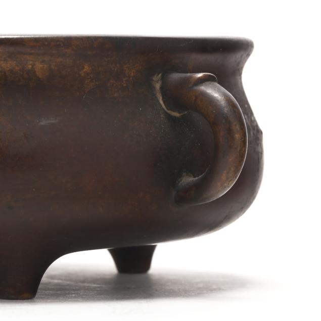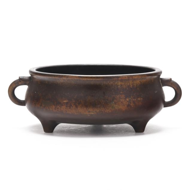 Qing dynasty (1644-1912), 18th or 19th century, smooth bronze censer, flanked by stylized loop handles with a small arch at top, with an apocryphal six character Xuande mark to underside.