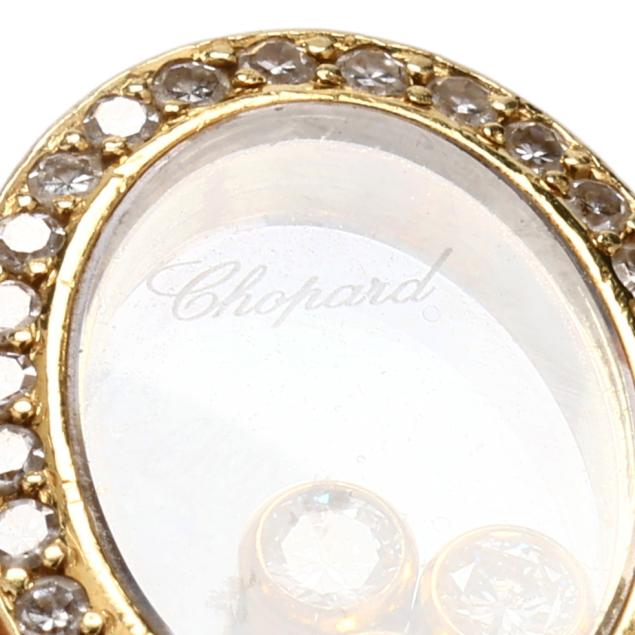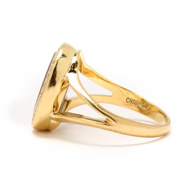 In oval form, with three free floating bezel set full cut round diamonds between two sapphire crystals, with prong set single cut round diamond surround, completed with split shank, the top sapphire crystal signed, the shank stamped Chopard, with maker's mark, and 750. The total diamond weight is approximately .37 total carat (H-I color, SI1-SI2 clarity).