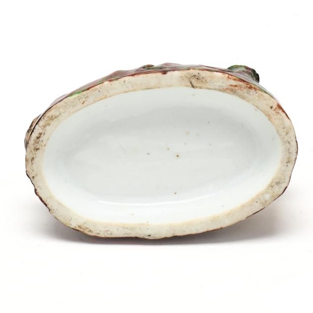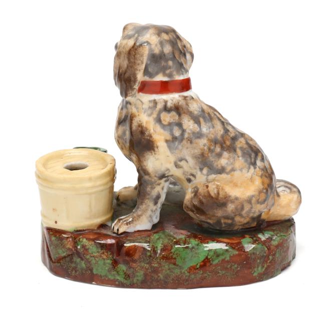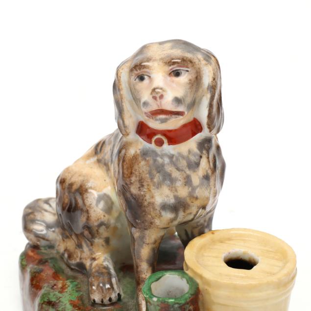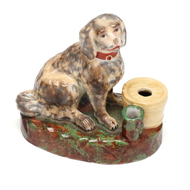 England, second half 19th century, hand-painted pearlware with sponge application to base, consisting of a barrel form inkwell next to mound form pen stand and a seated spaniel, unmarked.