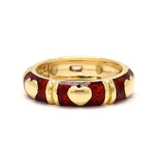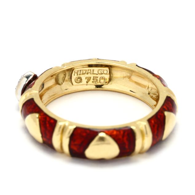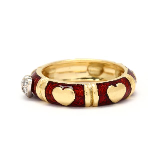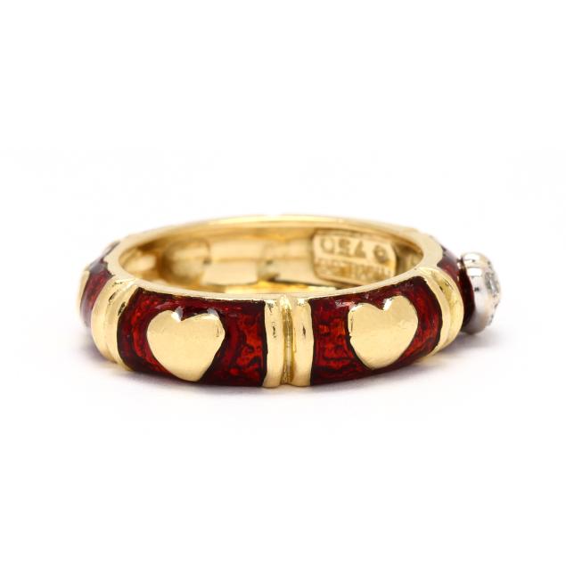 The gold band with repeating red enamel and gold heart motif, one heart in white gold, raised and pavé set with full cut round diamond melee, stamped Hidalgo / 750.