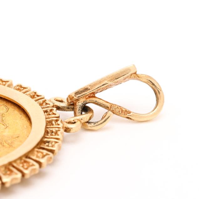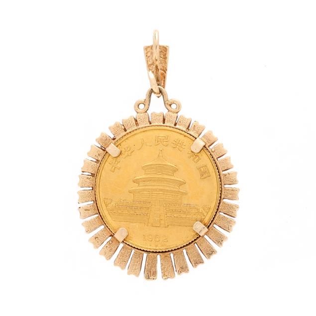 Centered on a gold panda 1/4 ounce coin, with tapering polished and textured surround, completed with a bail, bezel stamped IJ / 14KP, coin marked .999 and XRF testing 24KT.
