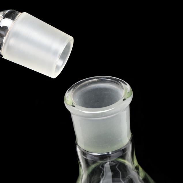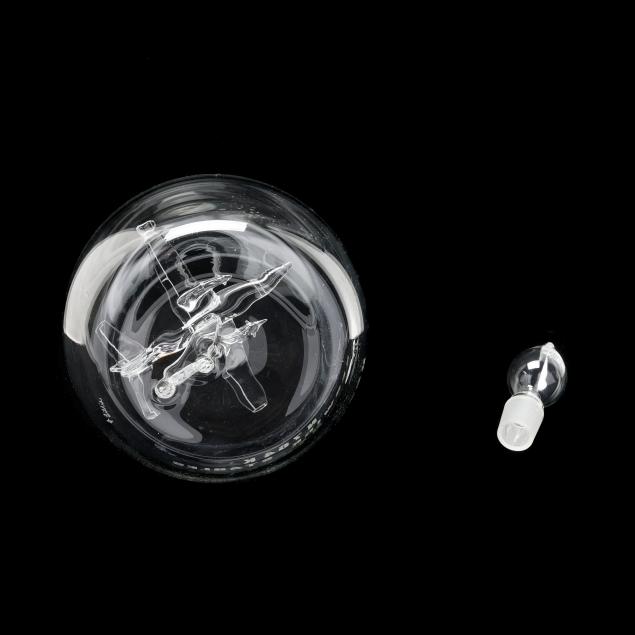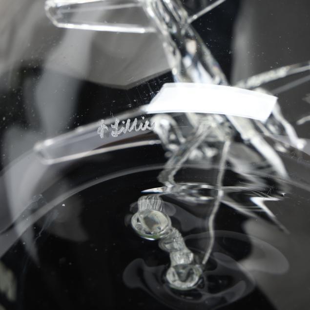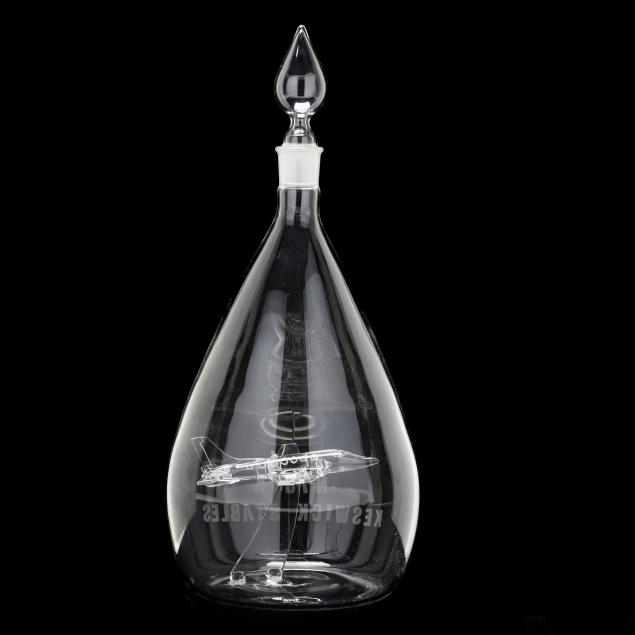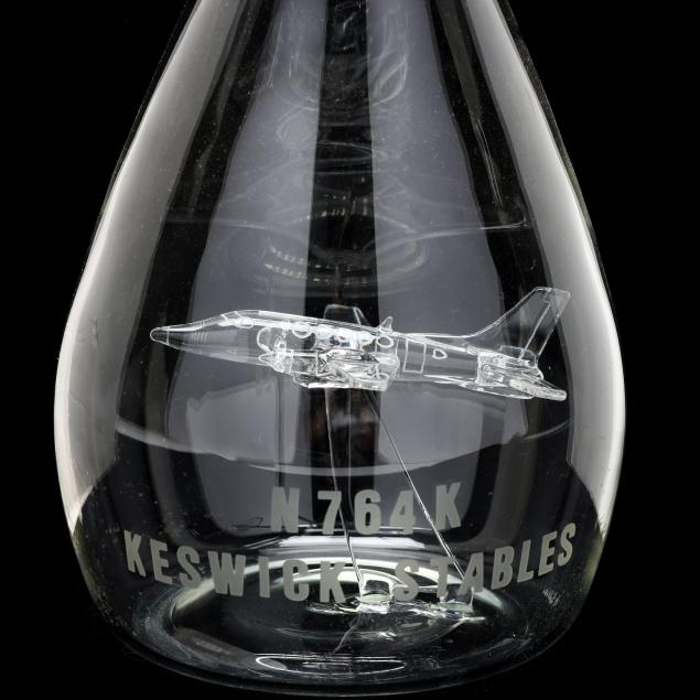 Mid-late 20th century, handblown glass decanter with etched glass airplane fitted to interior, frosted glass inner rim and stopper base, engraved "N 764 K/KESWICK STABLES" to body and signed "- Lillie" to base.