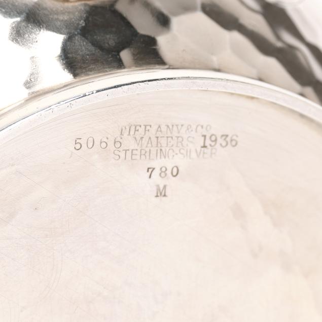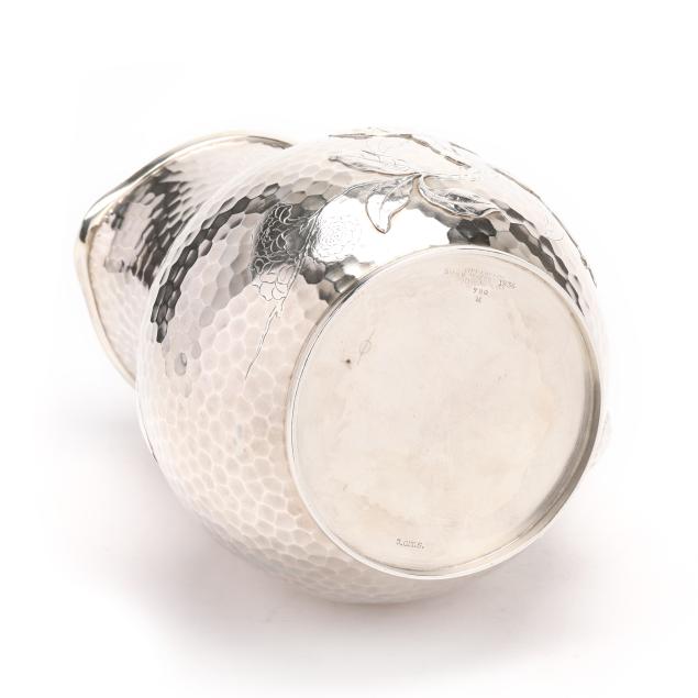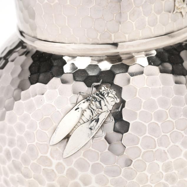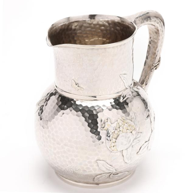 1873-1891 period hallmark, pattern number 5066, hammered surface with applied pomegranate fruits and leaves to etched and engraved flowering branches, insects complete the motif and include a scarab beetle, butterflies and a cicada applied to the handle and body while a dragonfly is etched atop the branch. No monograms.