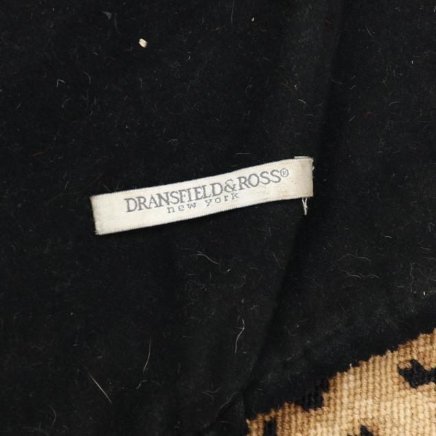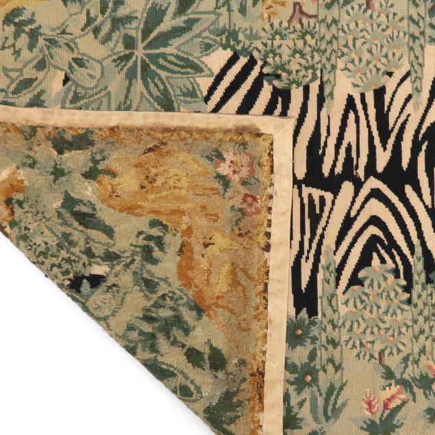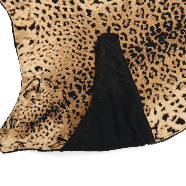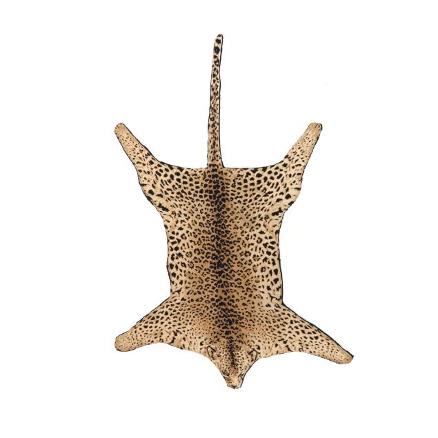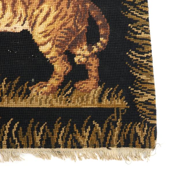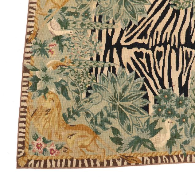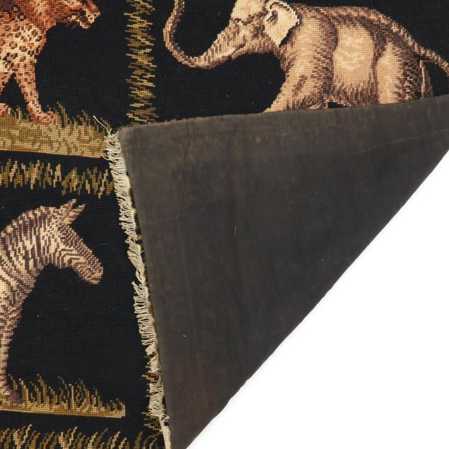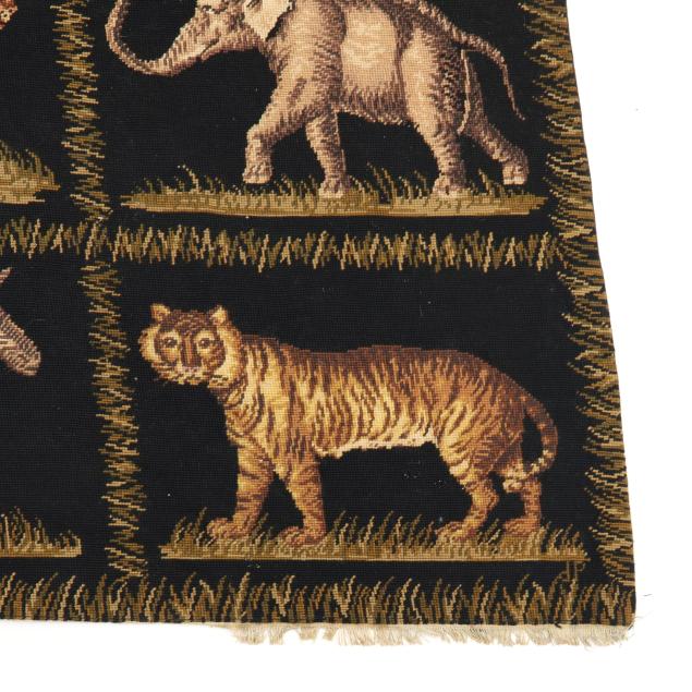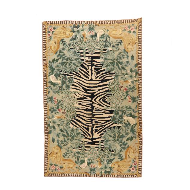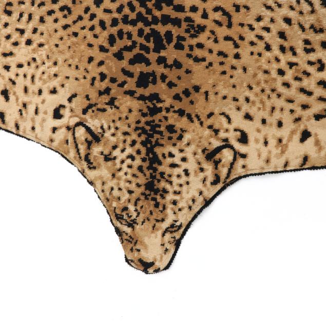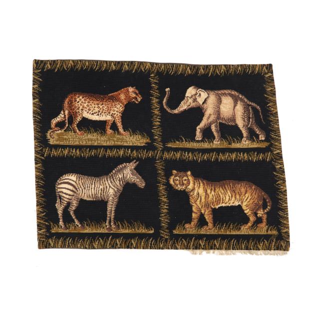 Wool; the first in the shape of a cheetah skin, with black fabric lining, label of Dransfield & Ross to verso (wear and fraying, staining) (90 in. from nose to tail, 57 in. wide); the second with central zebra skin motif surrounded by foliate and animal motifs, zebra stripe border (fading, discoloration, mis-shaping) (36 x 57 in.); the third with four jungle animals on black field, with grass motif border (fraying, separation of fabric lining, mis-shaping).