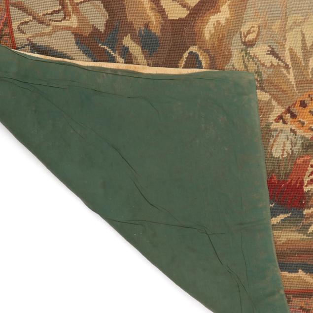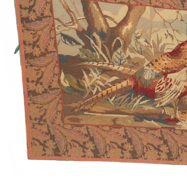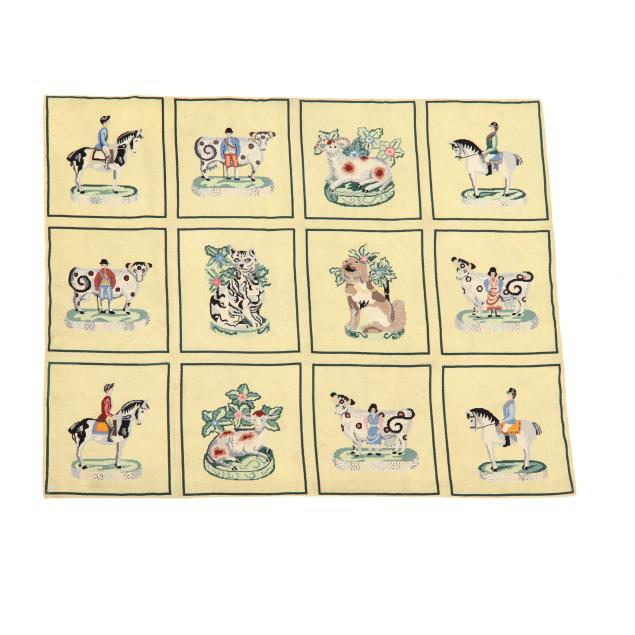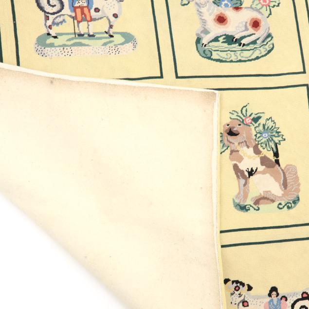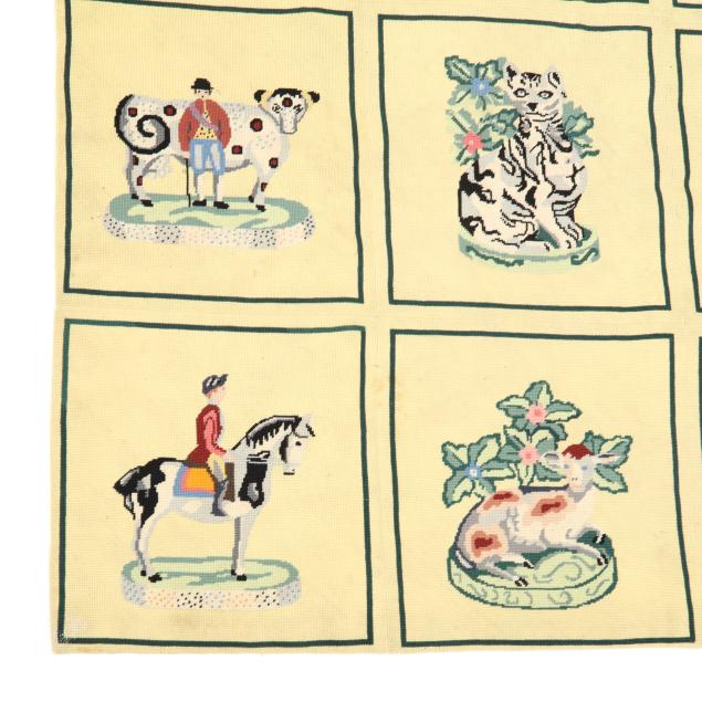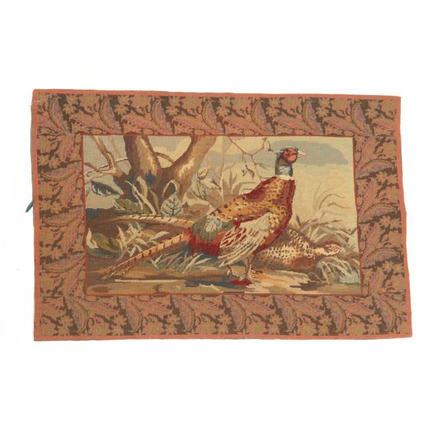 Wool; the first with square grid of Staffordshire style animal and figural motifs on pale yellow field with green stripe borders, with cotton canvas lining (staining, discoloration, fading, loss to stitching on one corner) (42 x 54 in.); the second with central pheasant in a landscape, with stylized foliate border (fading, mis-shaping, separation of fabric lining) (30 x 42 in.).