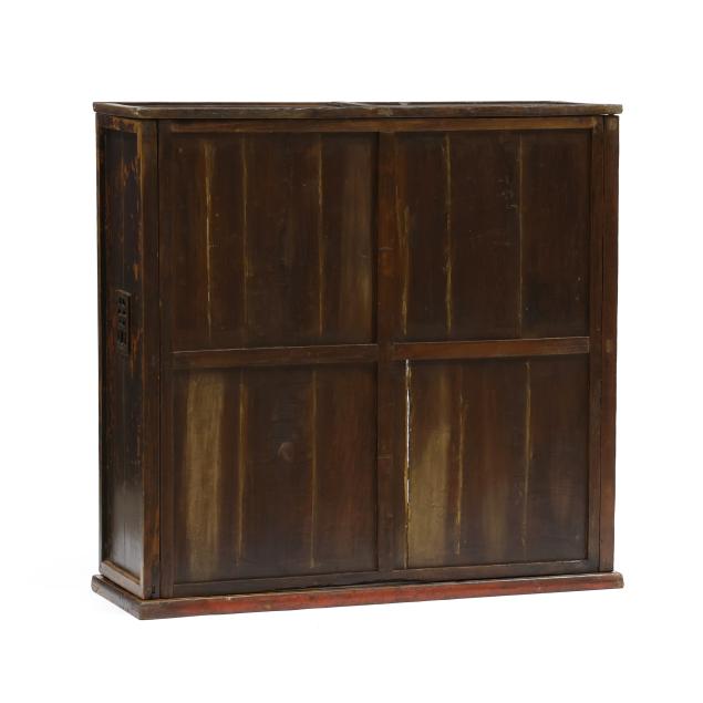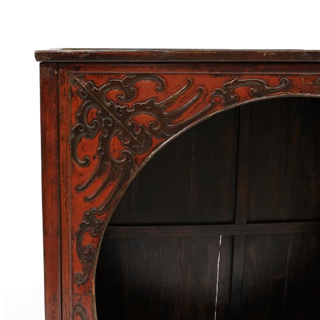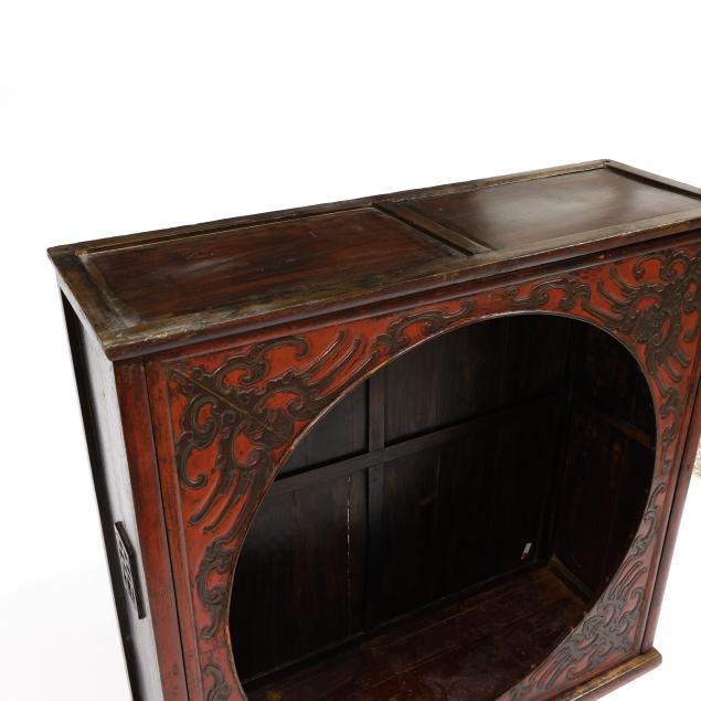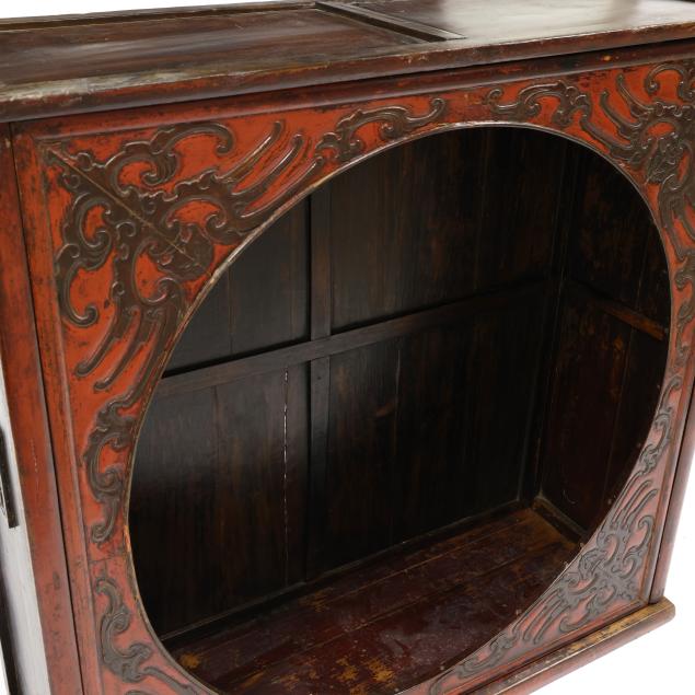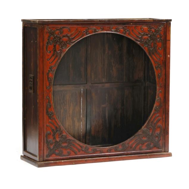 Late 19th or early 20th century, a rare moon view cabinet with large circle opening to front, carved wood with archaic scrolling pattern against a red ground, fits together without nails in traditional Chinese building method using interlocking joinery.