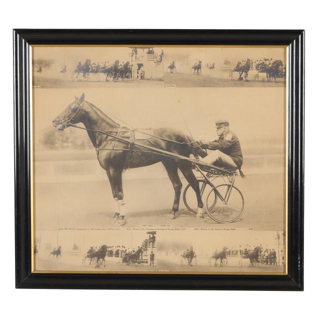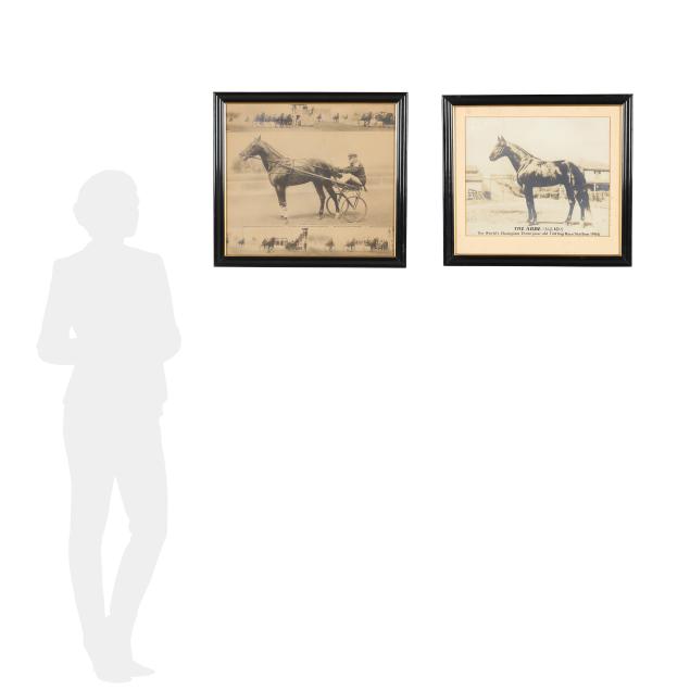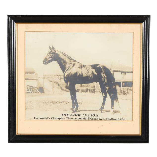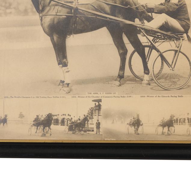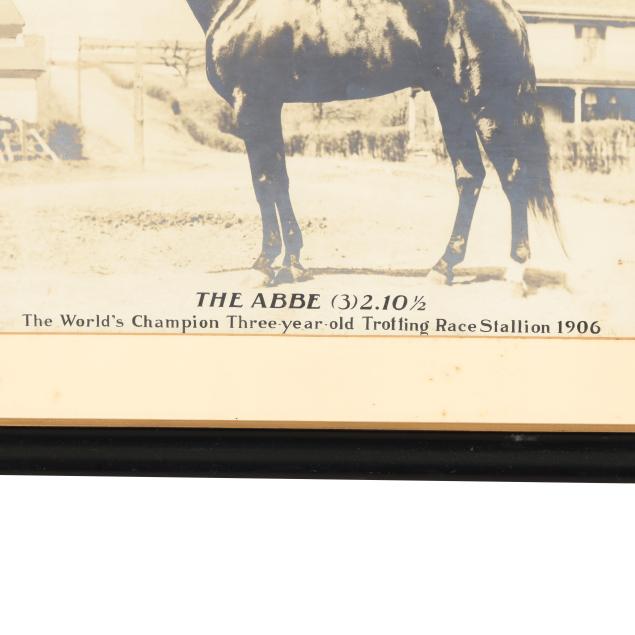 The first, a gelatin silver print, circa 1910s, featuring "The Abbe, E. F. GEERS UP / 1906- The World's Champion Three-year-old Trotting Race Stallion 2:10 1/2 ; 1910 Winner of the Chamber of Commerce Pacing Stake 2:04 1/2; 1910 - Winner of the Edwards Pacing Stake 2:04"; the second, a gelatin silver print, circa 1910s, featuring "The Abbe (3) 2.10 1/2 / The World's Champion three-year-old Trotting Race Stallion 1906"; both framed below glass.