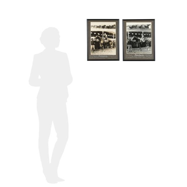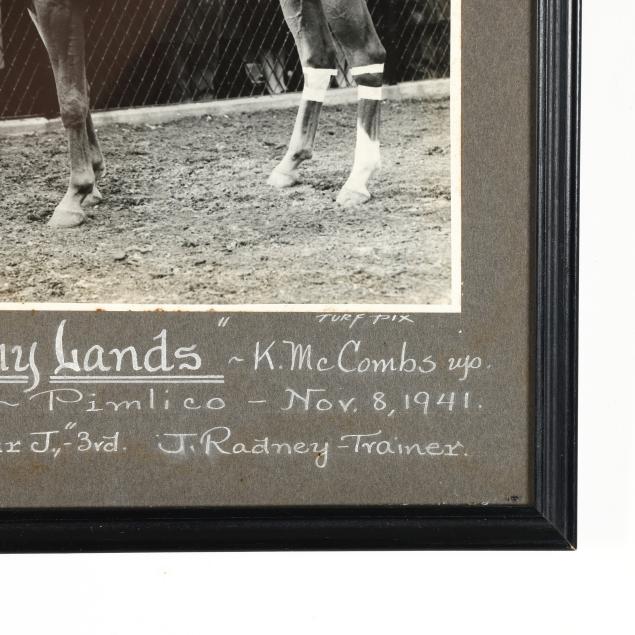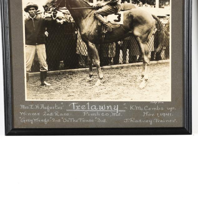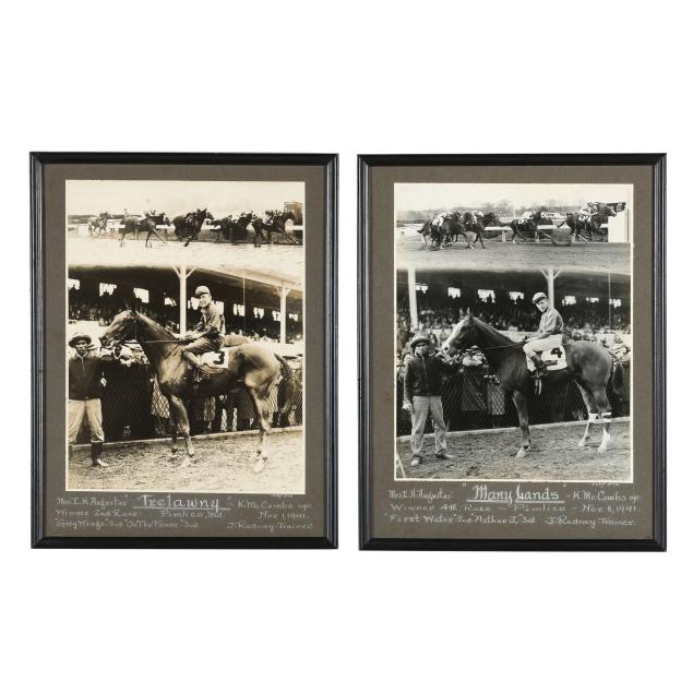 Each a black and white photograph, 1941, featuring "Manylands / Winner 4th Race / Pimlico"; and "Trelawny / Winner 2nd Race / Pimlico," mounted and framed under glass.