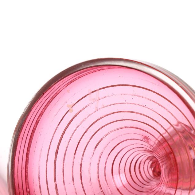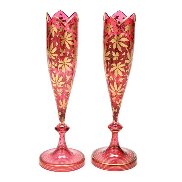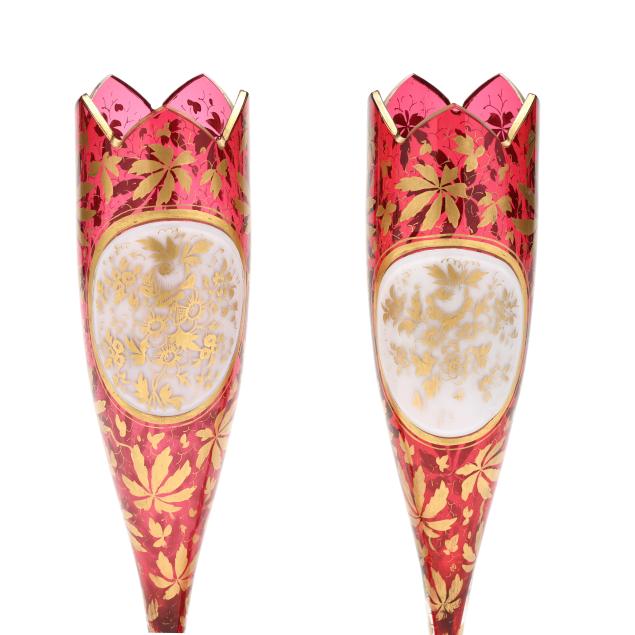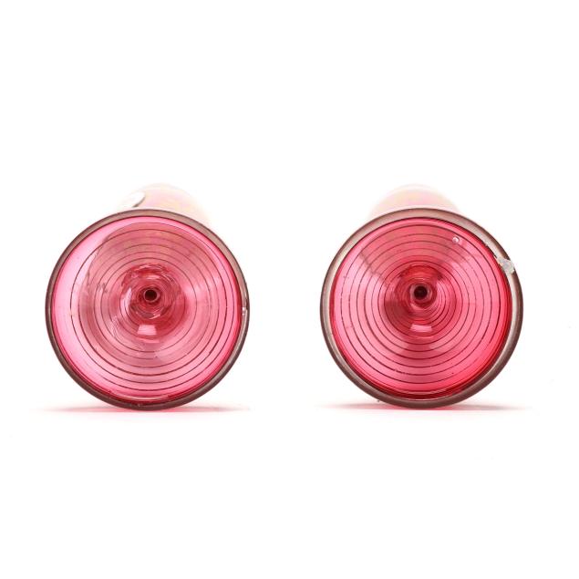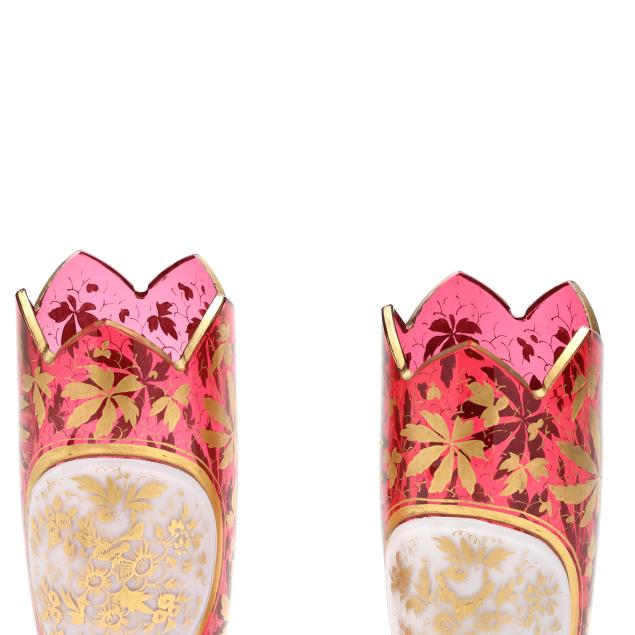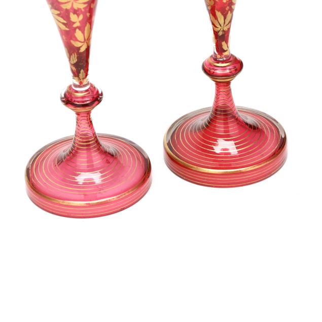 attributed Moser, Pair of Cranberry Glass Mantel Vases