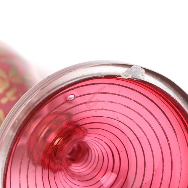 Late 19th century, cranberry glass with white cabochons having gilt foliate highlights, unmarked.