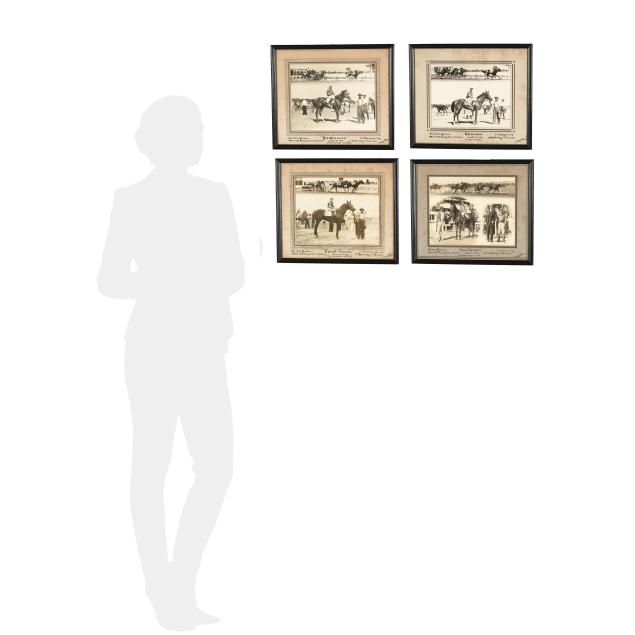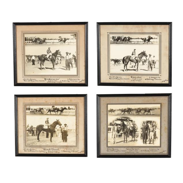 Each a black and white photograph, 1939-1941, including "Tantrum", "Frost Flower", "Elmada", and "Brakeman" all at various racing events including "River Downs" and "Thistle Down"; all matted and framed below glass.