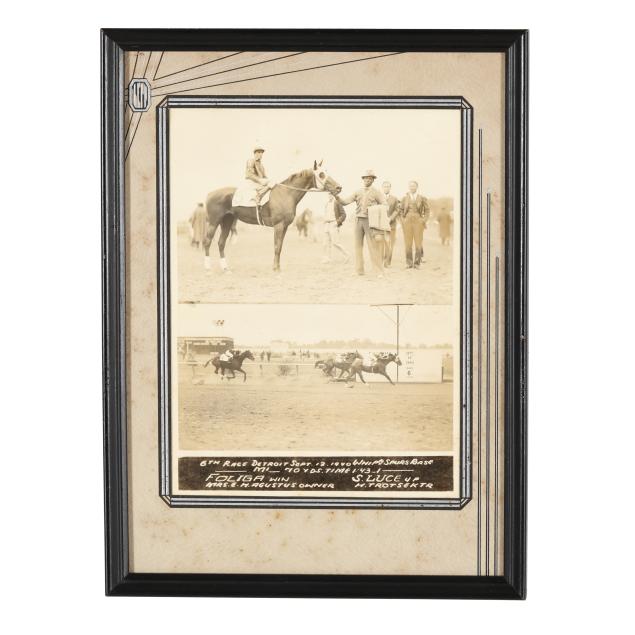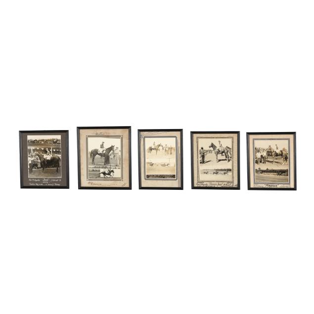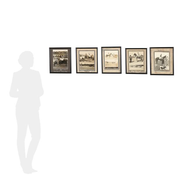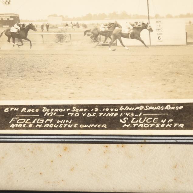 Each a black and white photograph, 1940-1946, including "Scorch", "Magnus", "Foliga", "Seven Seas", and "Azizi" depicted at various events in Detroit, Pimlico, and Delaware Park; all matted and framed below glass with race details inscribed to the lower mat.
